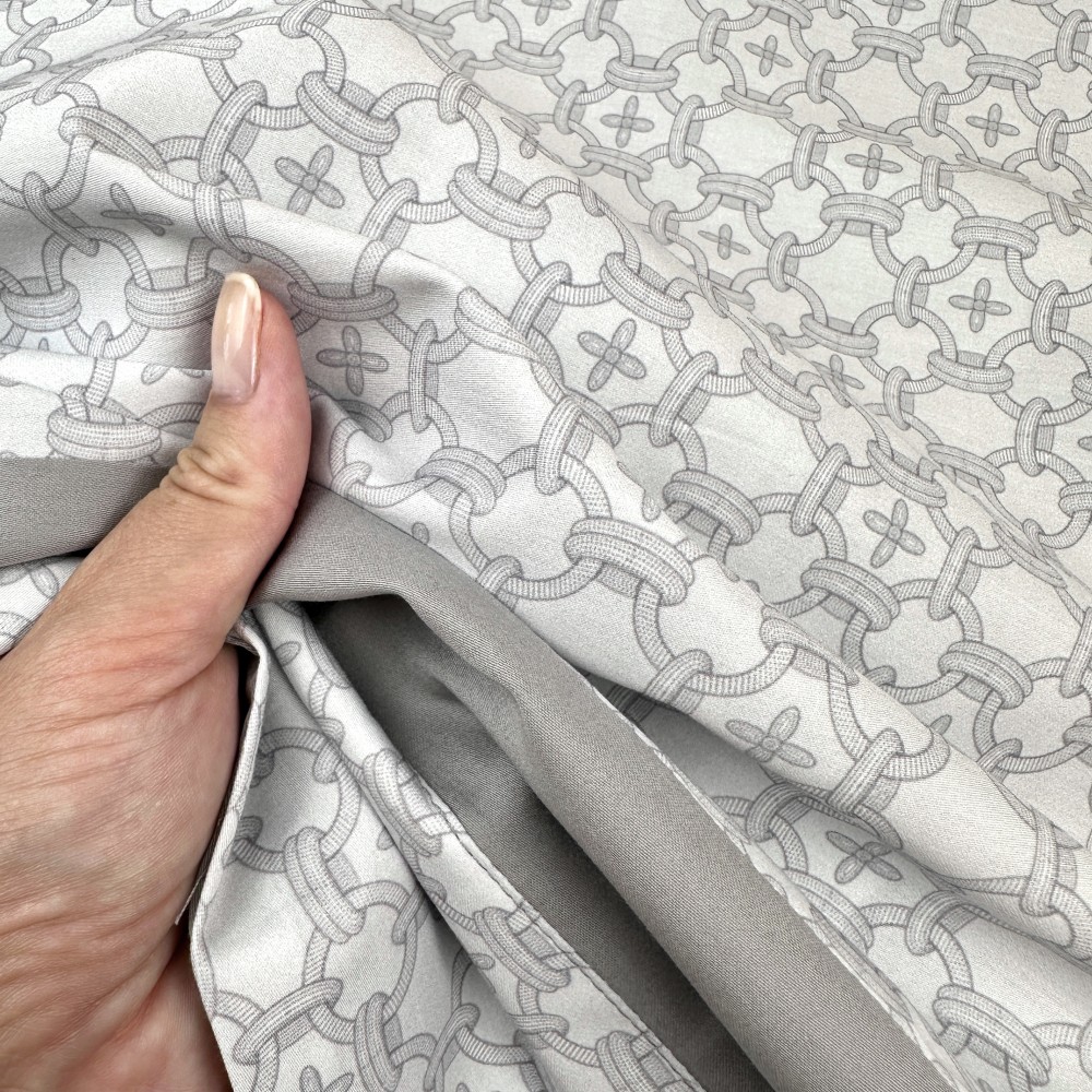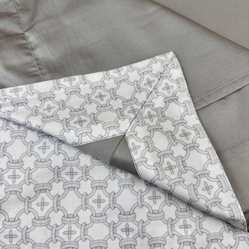 В дизайне «Alexander» использован лаконичный принт, благородные серые оттенки и аккуратный декор из ткани-компаньона. Внешняя сторона пододеяльников и наволочек в размере 50х70 см украшены принтом с переплетенными колечками. Обратная сторона пододеяльников и наволочек в размере 50х70 см, простыни и наволочки в размере 70х70 см выполнены из однотонной ткани-компаньона.