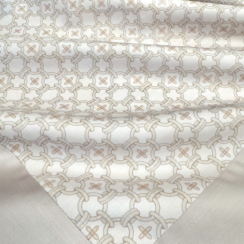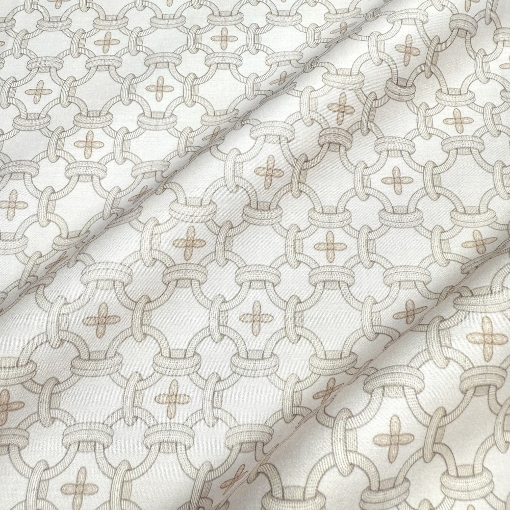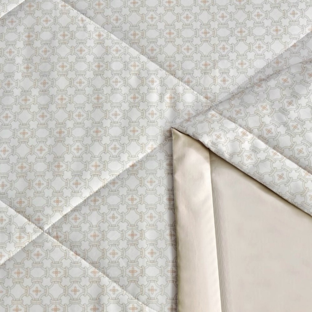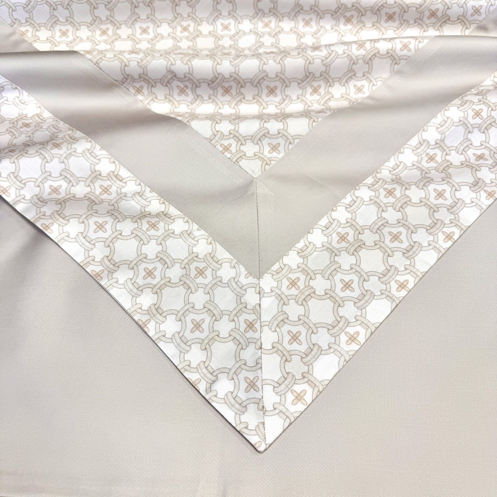 В дизайне «Alexandra» использован лаконичный принт, спокойные оттенки и аккуратный декор из ткани-компаньона. Внешняя сторона одеял и наволочки украшены принтом с переплетенными колечками. Обратная сторона одеял и простыни выполнены из однотонной ткани-компаньона в серо-бежевом оттенке.