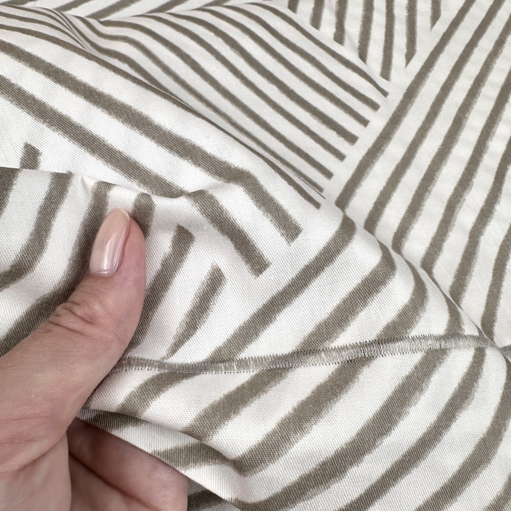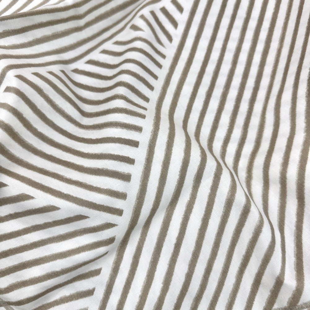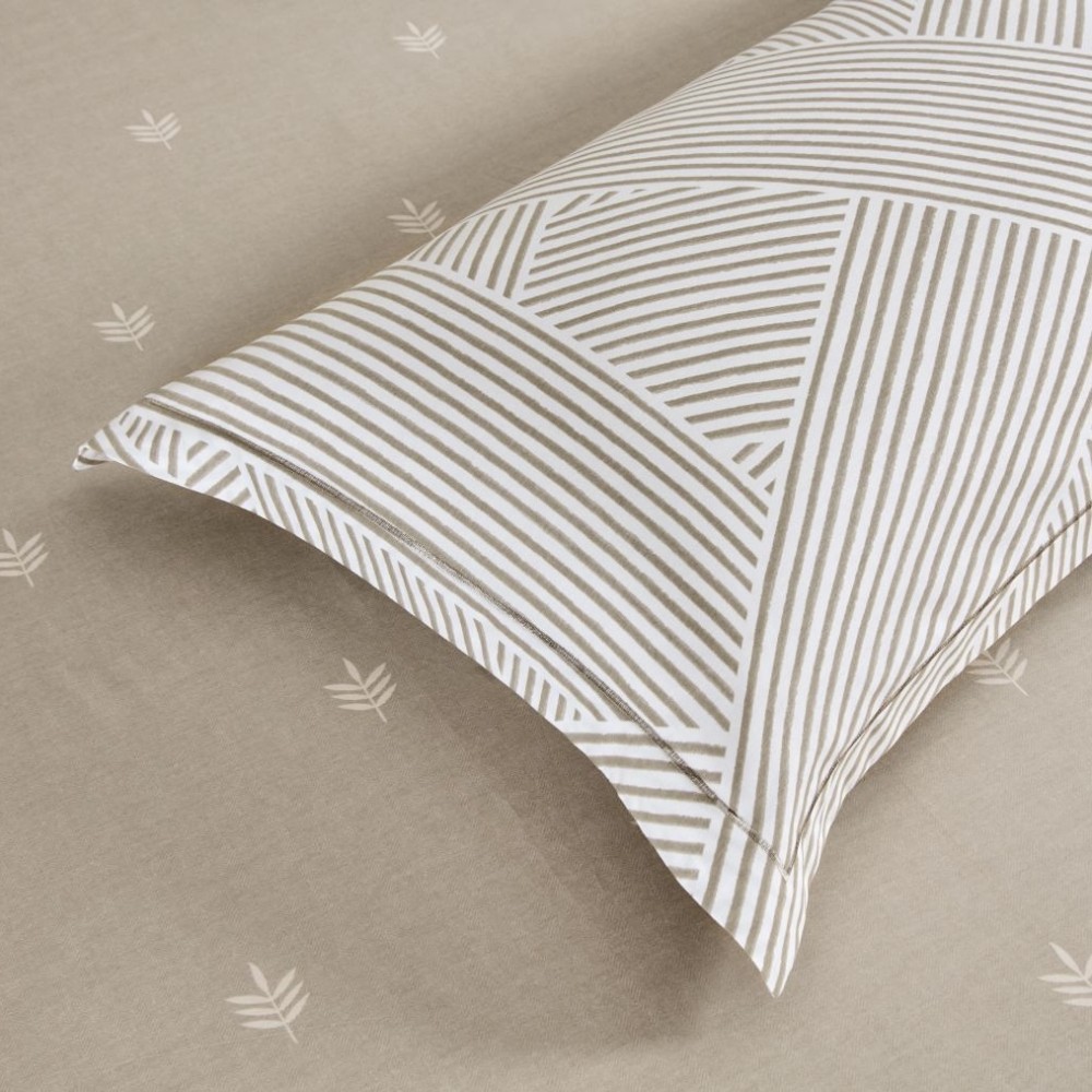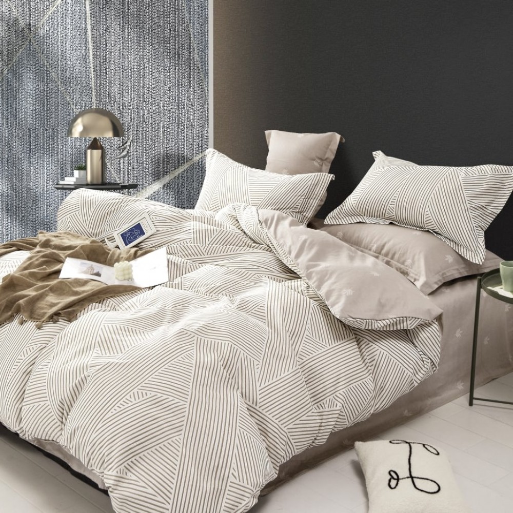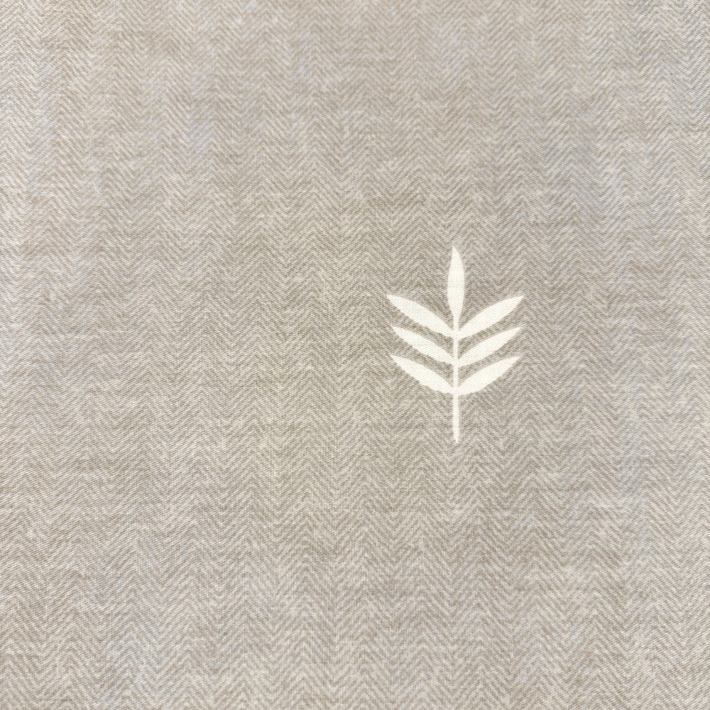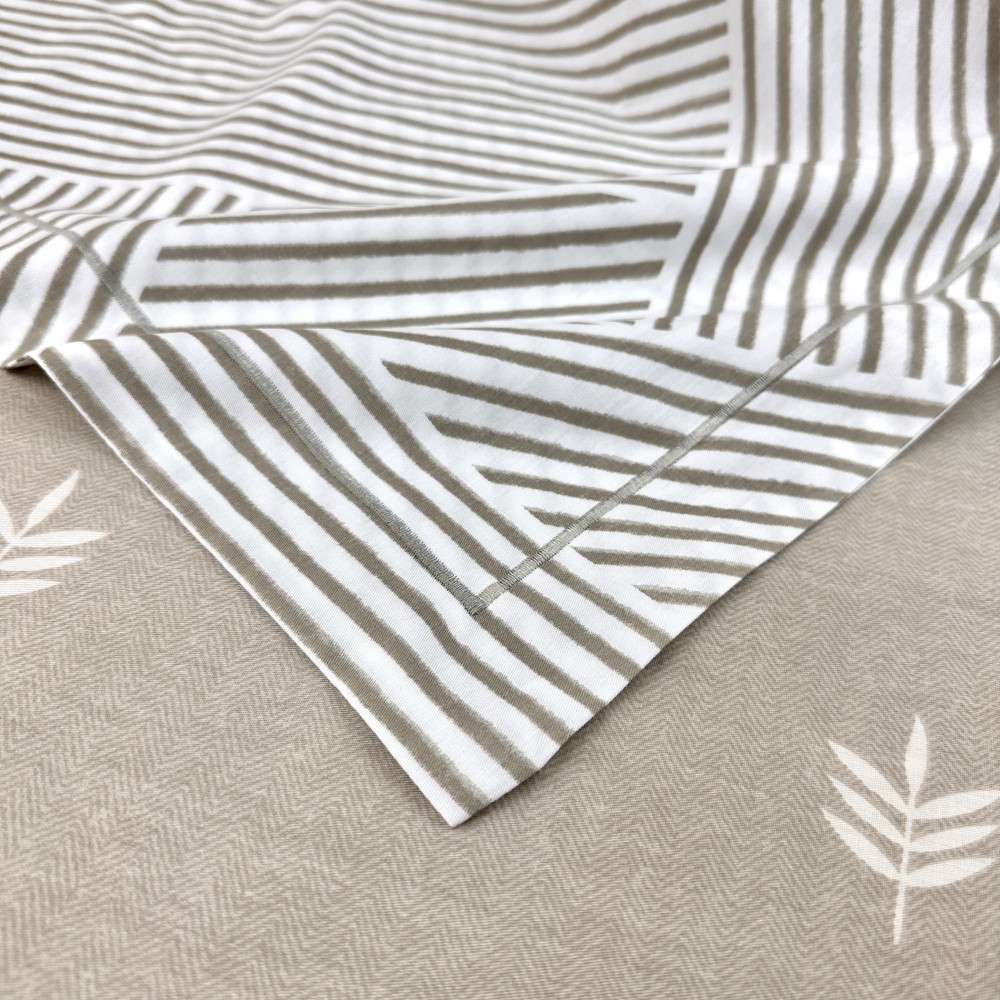 Дизайн постельного белья «Helmi» - это сканди в натуральных природных оттенках. Внешняя сторона пододеяльников и наволочки в размере 50х70 см выполнены в белом цвете с полосками серо-бежевого оттенка. Обратная сторона пододеяльников, простыни и наволочки в размере 70х70 см выполнены из ткани-компаньона в серо-бежевом оттенке с узором в елочку и небольшими листочками.