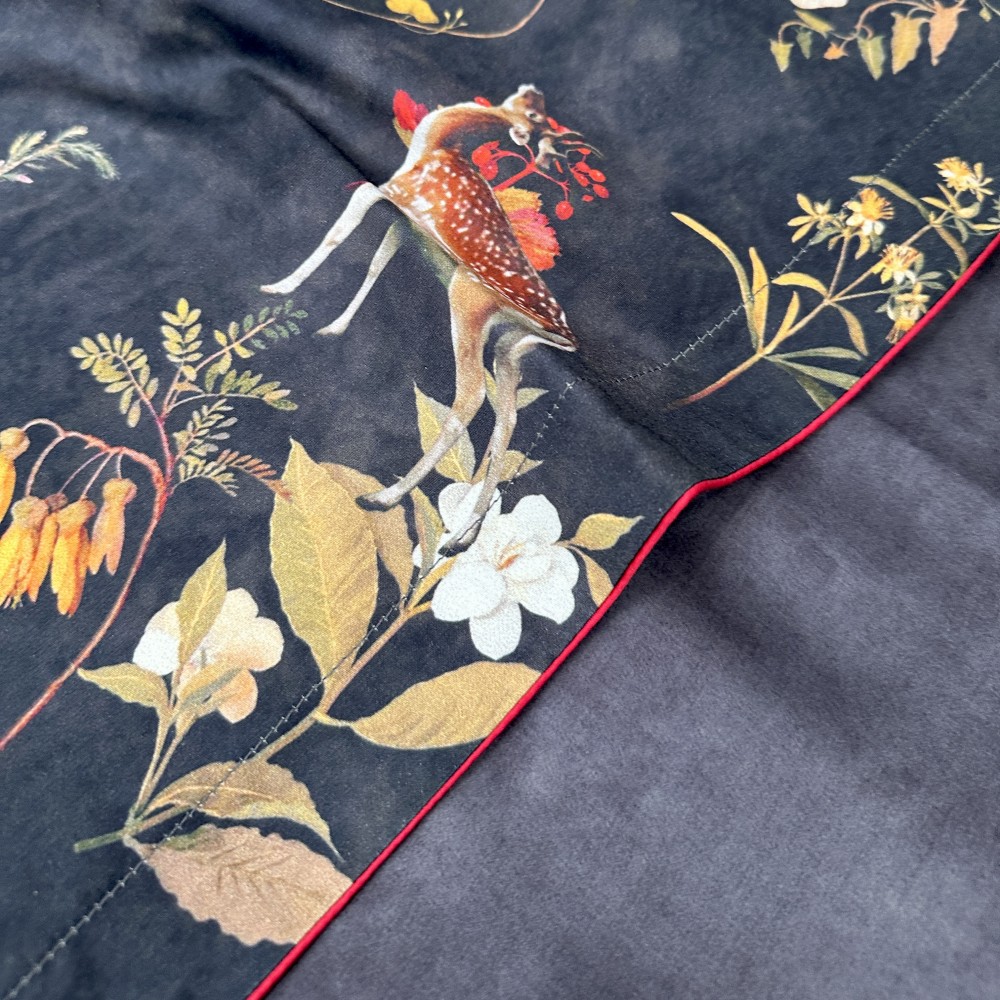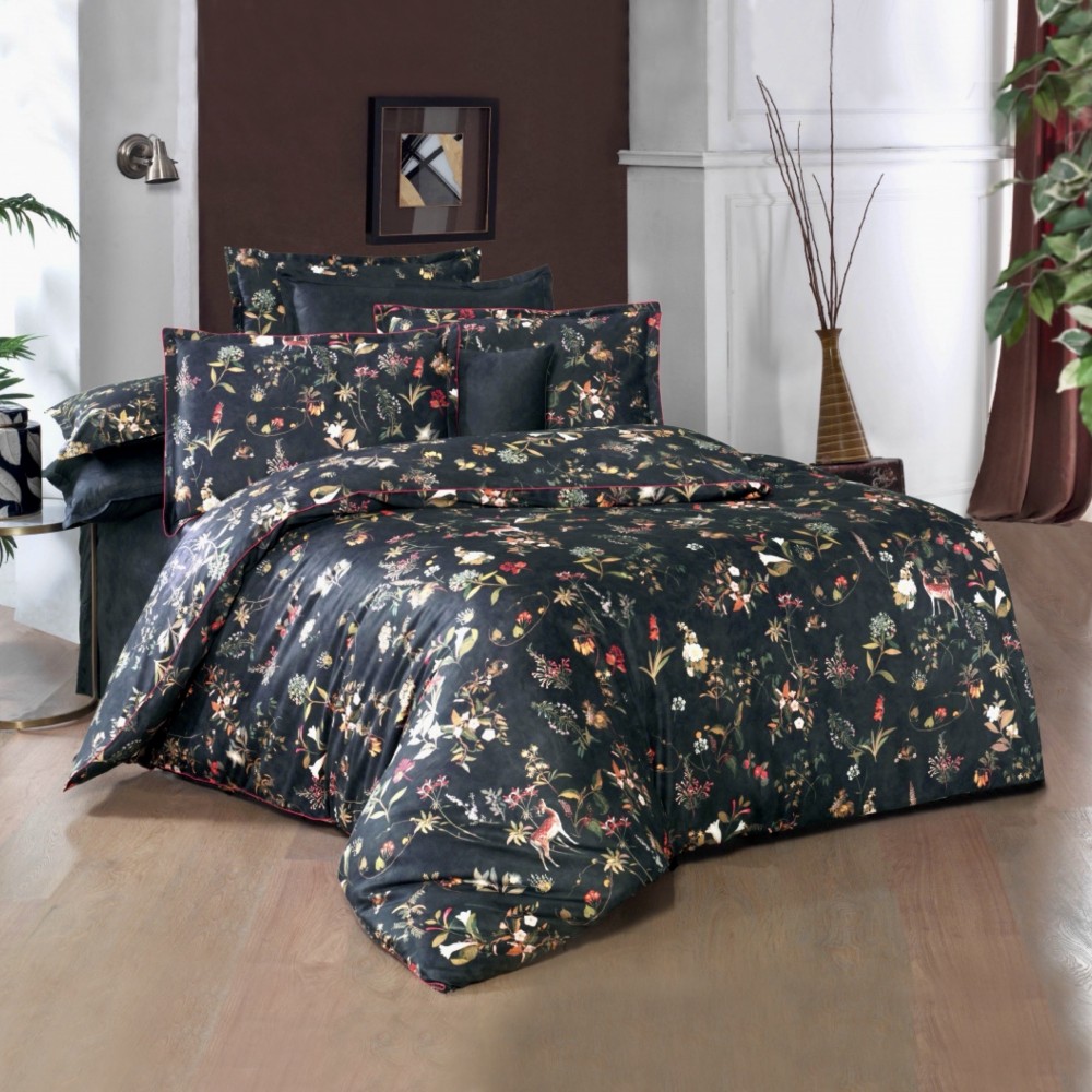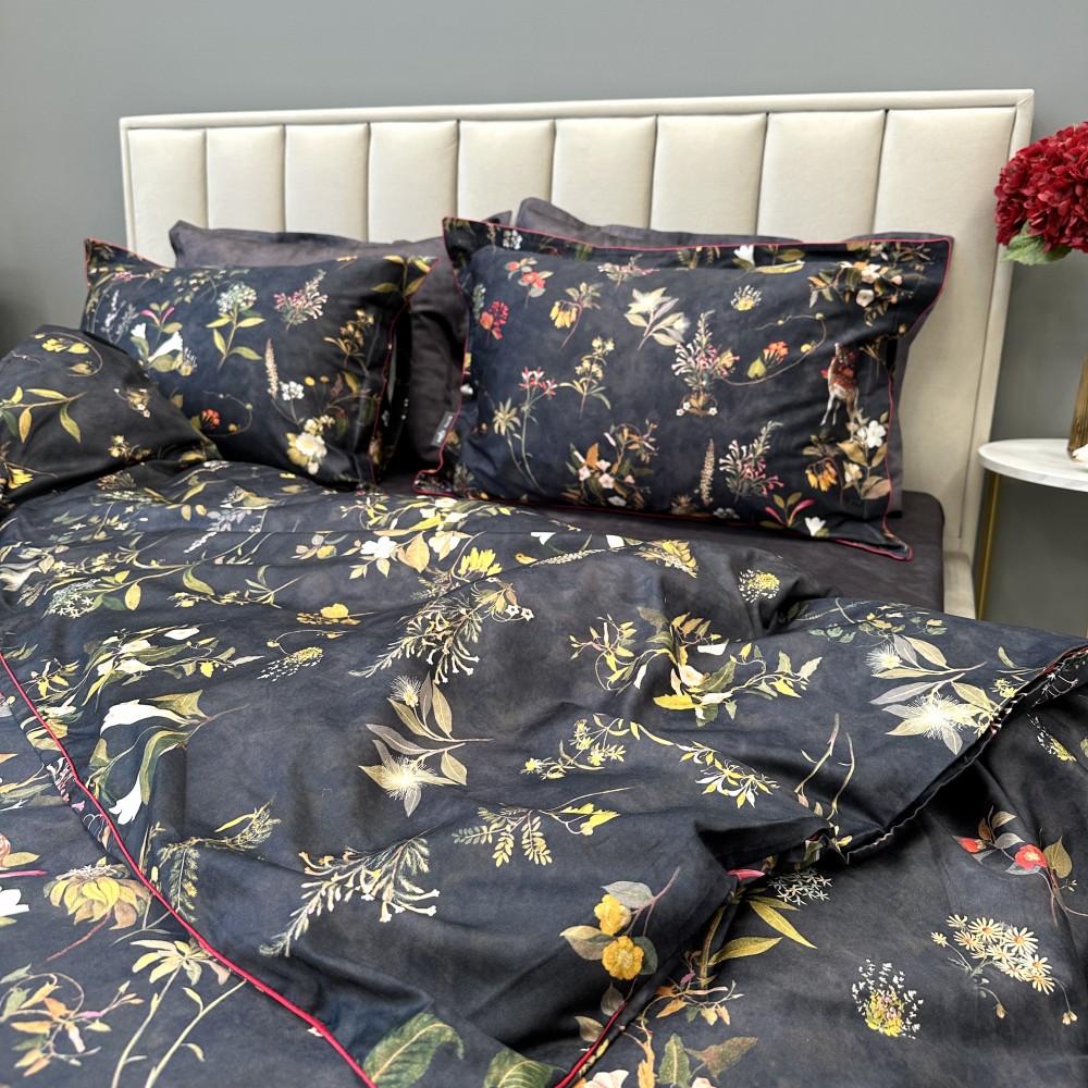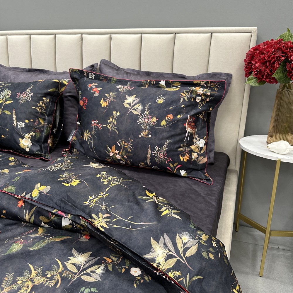 Постельное белье «Jenny» создает невероятную атмосферу диковинного туманного леса золотой осенью. Основной оттенок комплекта - темный антрацит. Принт сделан так, будто по ткани клубится золотистый туман. Благодаря этому эффекту ткань кажется еще более блестящей, переливающейся на свету. В дизайне использованы три дополняющих друг друга принта. Основная ткань украшена изящными цветами - тут и фрезии, и вьюнки, и акция, и липовый цвет, и северные верески, и ягоды калины, среди которых притаились шикарные пятнистые олени. В рисунке использованы золотистые и красные акценты. Вторая ткань украшена такими же цветами и растениями, но рисунок выдержан в золотистых тонах. И третья ткань-компаньон чуть светлее, уходит в антарцитово-лиловый тон. Она без рисунка.