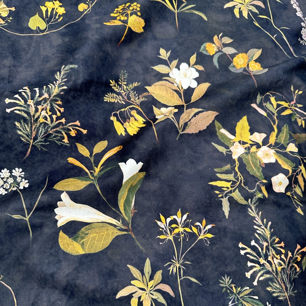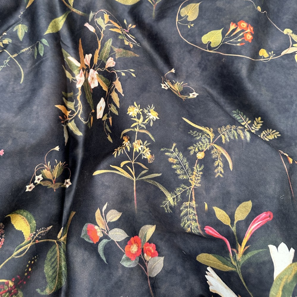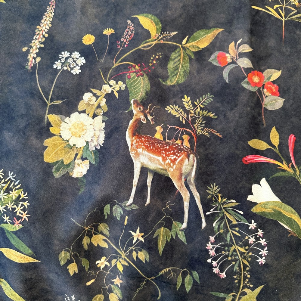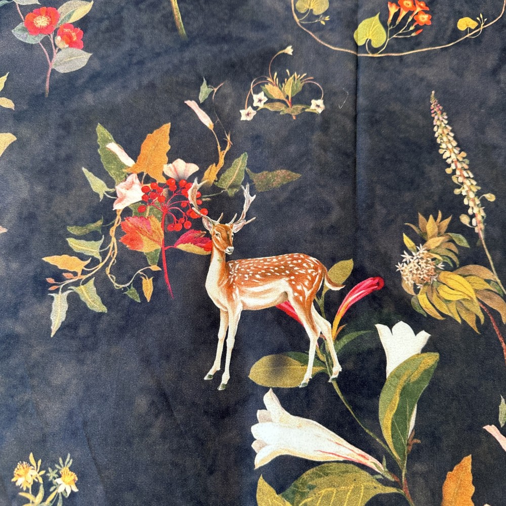 Постельное белье «Jenny» создает невероятную атмосферу диковинного туманного леса золотой осенью. Основной оттенок комплекта - темный антрацит. Принт сделан так, будто по ткани клубится золотистый туман. Благодаря этому эффекту ткань кажется еще более блестящей, переливающейся на свету. В дизайне использованы три дополняющих друг друга принта. Основная ткань украшена изящными цветами - тут и фрезии, и вьюнки, и акция, и липовый цвет, и северные верески, и ягоды калины, среди которых притаились шикарные пятнистые олени. В рисунке использованы золотистые и красные акценты. Вторая ткань украшена такими же цветами и растениями, но рисунок выдержан в золотистых тонах. И третья ткань-компаньон чуть светлее, уходит в антарцитово-лиловый тон. Она без рисунка.