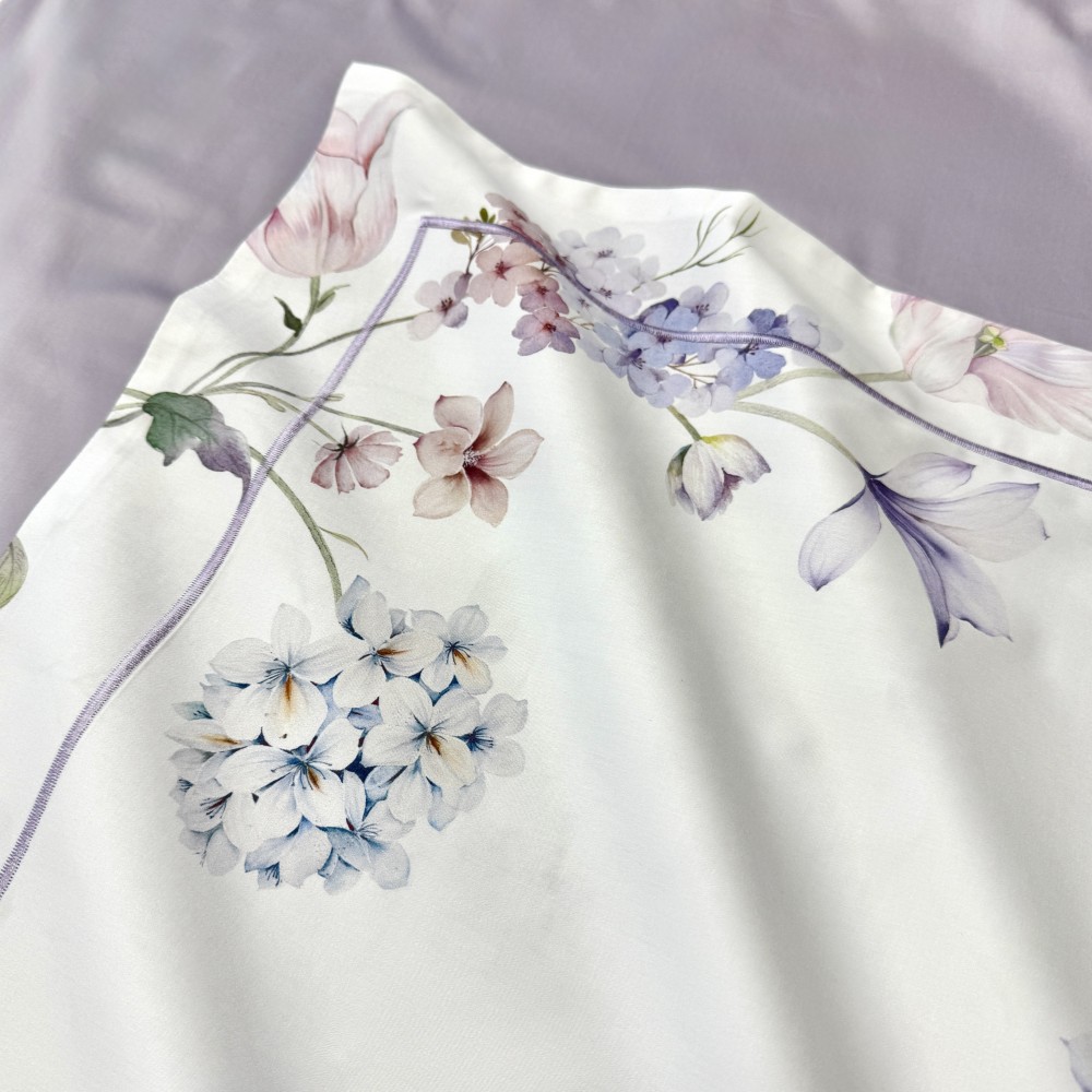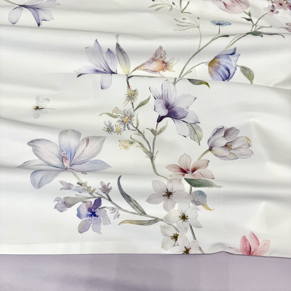 Внешняя сторона пододеяльников и наволочки в размере 50х70 см выполнены в белом цвете и украшены нежным цветочными рисунком. Обратная сторона пододеяльников, простыни и наволочки в размере 70х70 см выполнены из однотонной ткани-компаньона светло-сиреневого оттенка.