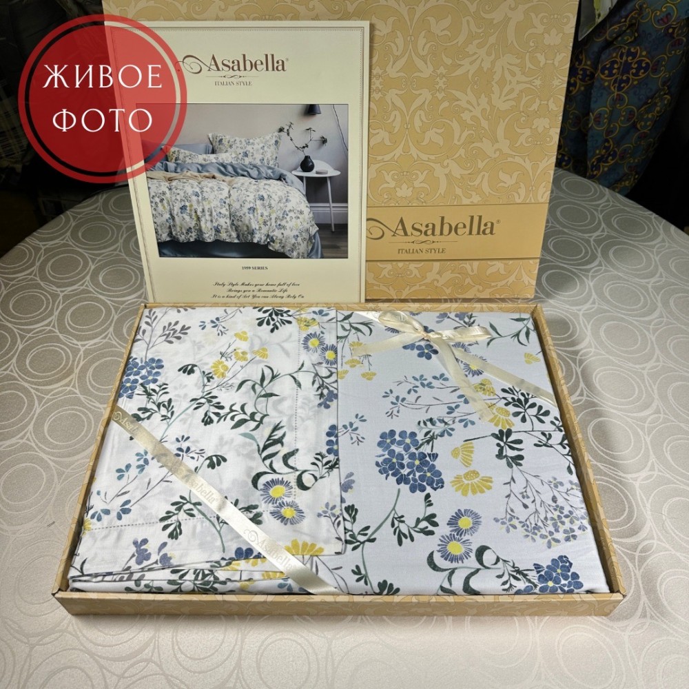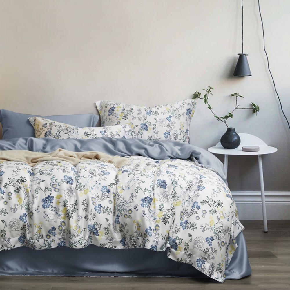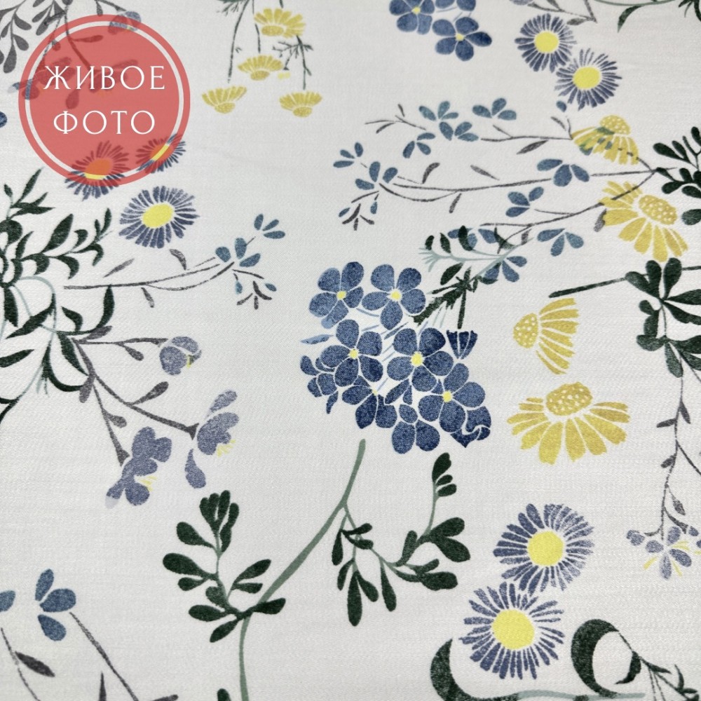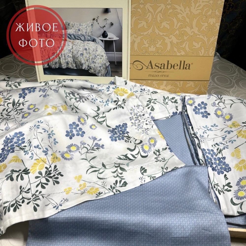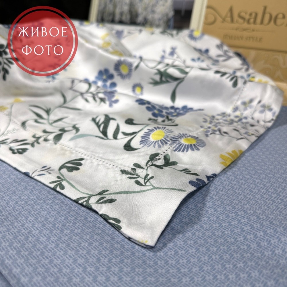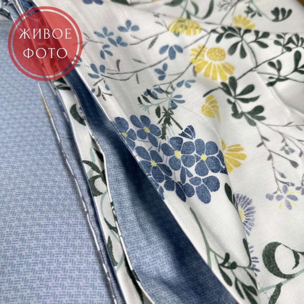 Внешняя сторона пододеяльников и наволочки в размере 50х70 см выполнены в белом цвете и украшены желтыми и синими цветочками. Обратная сторона пододеяльников, простыни и наволочки в размере 70х70 см выполнены из ткани-компаньона в светло-синем цвете.