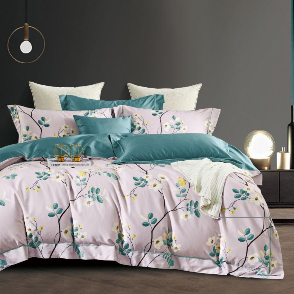 Внешняя сторона пододеяльников и наволочки в размере 50х70 см украшены нежными цветами на веточках. Обратная сторона пододеяльников, простыни и наволочки в размере 70х70 см выполнены из однотонной ткани-компаньона.