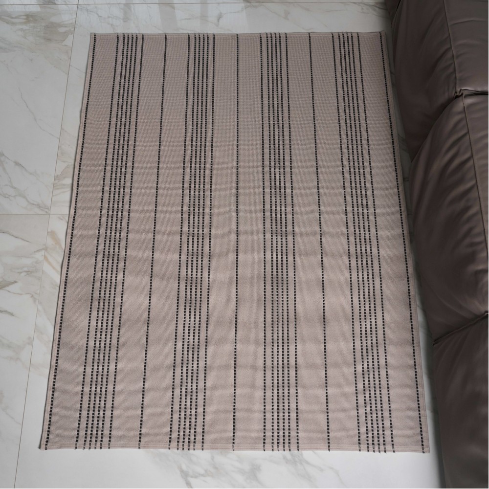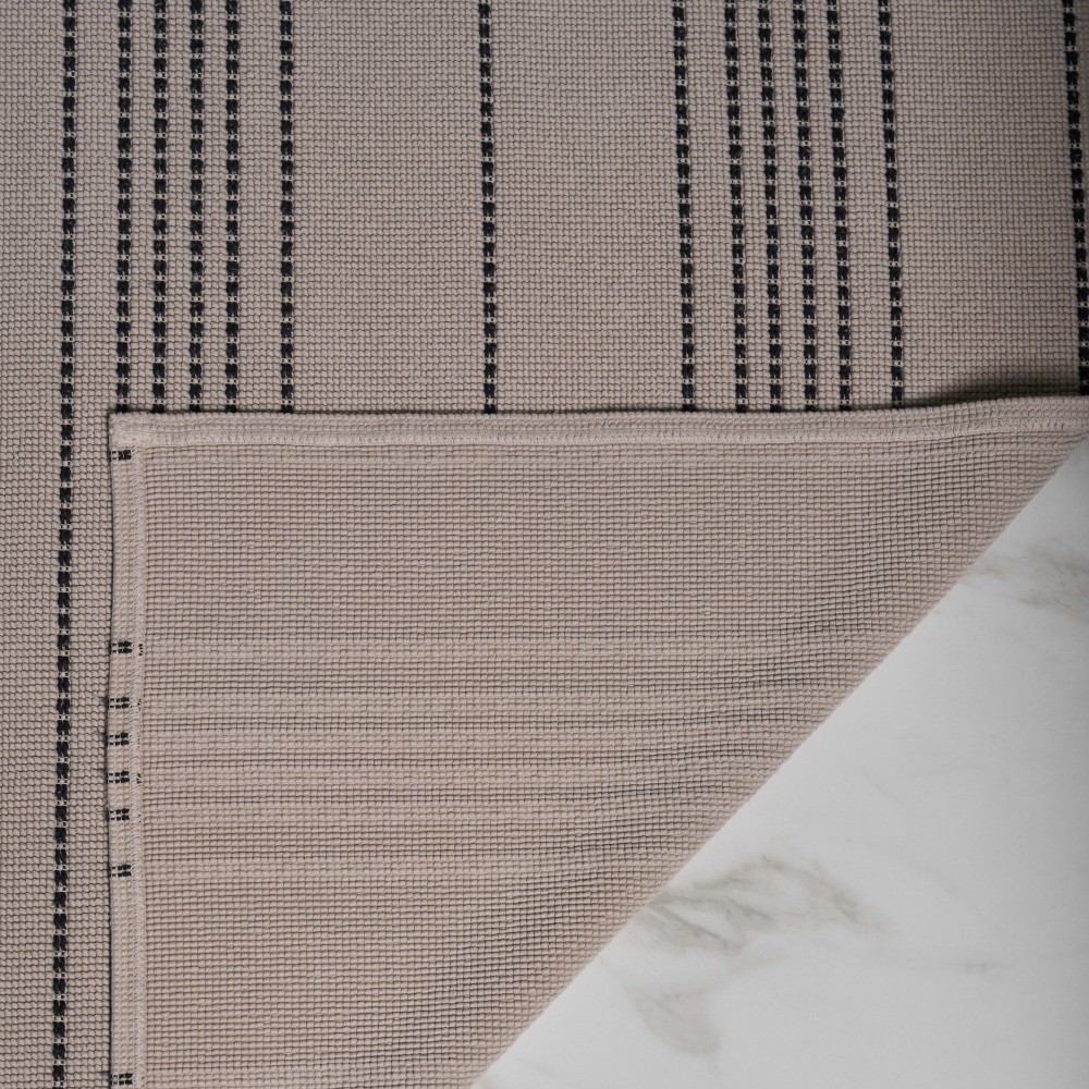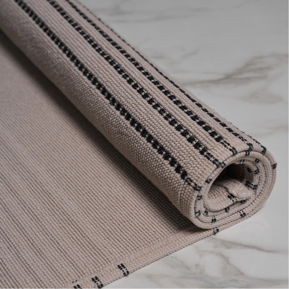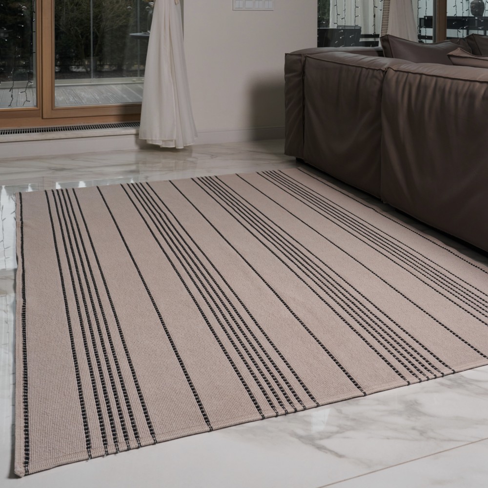 Ковер «Lino» португальского производства выполнен из 100% хлопка в петельчатой технике. Узор ковра формируется за счет петель разной высоты. Петли плотные, из толстой хлопковой пряжи, образуют ровное полотно, которое декорировано контрастными черными полосами. Ковер выполнен в оттенке кофе с молоком. Благодаря натуральному составу ковер не только приятный тактильно, но и неприхотлив в уходе. Его можно пропылесосить или просто вытряхнуть, локально удалить загрязнения и даже постирать. Стильный и практичный он добавит тепла и уюта вашему интерьеру.
