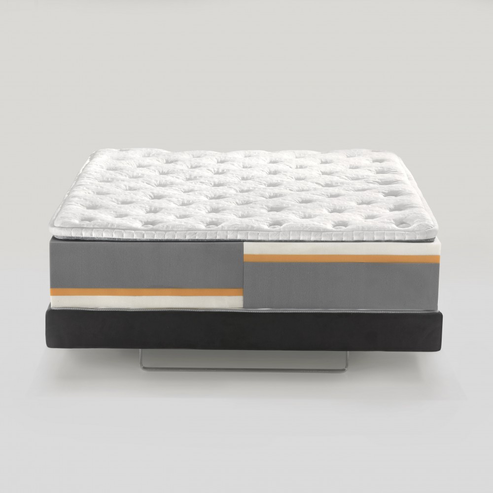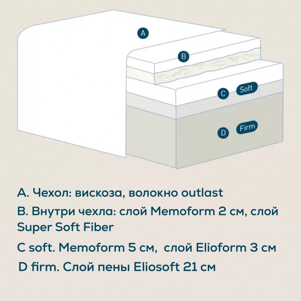 Основной блок матраса сделан из пены Eliosoft (21 см). Этот слой обладает средней степенью поддержки. А благодаря его высоте эта сторона матраса получилась умеренно-мягкой. Далее идет слой пены Elioform (3 см). Это пена высокой плотности, она обладает средней жесткостью и высокой ортопедичностью. Этот слой дает дополнительную поддержку спине. Завершает основу матраса слой пены Memoform (5 см). Пена Memoform является одной из самых мягких и обладает эффектом памяти формы. Она «запоминает» изгибы вашего тела, позволяя достичь максимального расслабления мышц. Эта сторона мягкая.