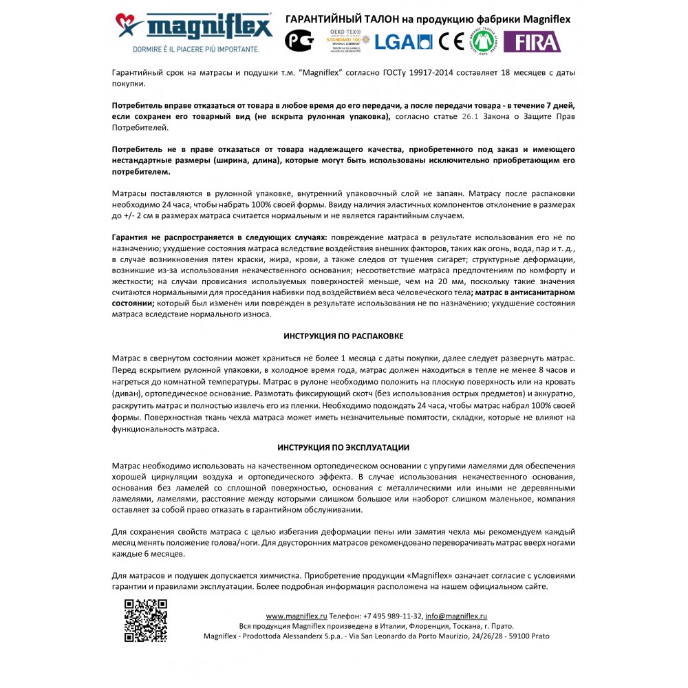 Матрасы от бренда Magniflex беспружинные. За степень поддержки и жесткости в матрасе отвечают блоки из высококачественной полимерной пены микропористой структуры, выполненной с применением натуральных природных материалов (сок дерева гивеи). В конструкции матраса использована технология Dual Core. Матрас состоит из двух независимых половинок, каждая из которых имеет мягкую сторону и сторону средней мягкости. Перевернув половинку другой стороной вы можете изменить степень комфорта только одной половины матраса.