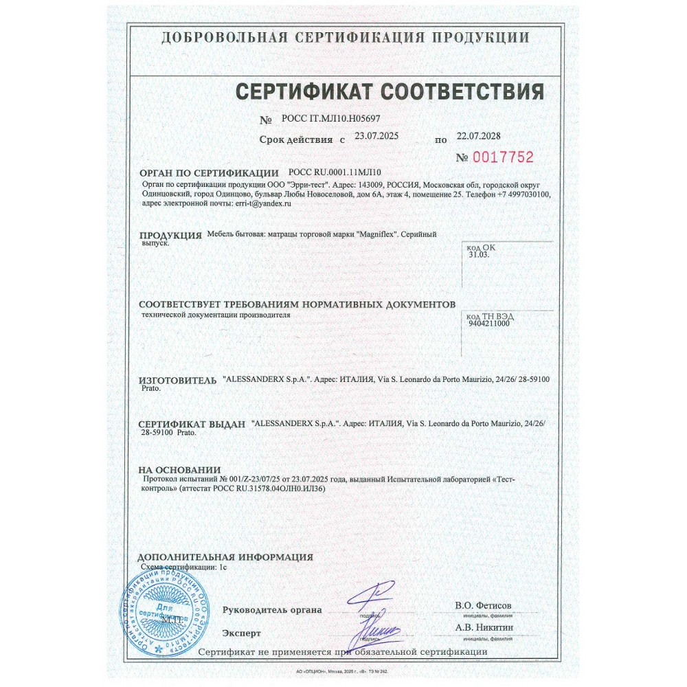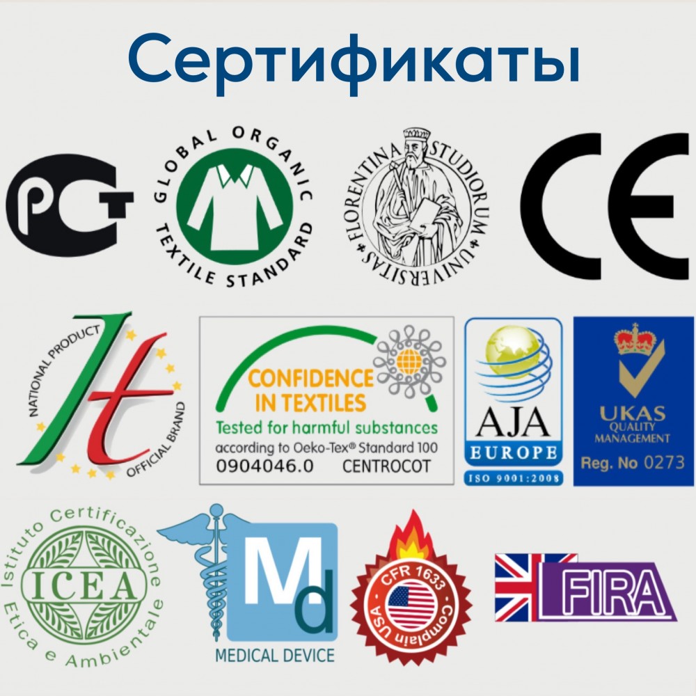 Сертификаты: соответствия ГОСТ Р № РОСС IT.МЛ10.Н05697, GOTS, Florentina Studiorium Universitas, CE (Conformité Européenne), 100% Made in Italy, AJA Registras, UKAS, ICEA, Oeko-Tex Standart 100, Medical Device, CFR, FIRA, рекомендация ЦНИИ Травмотологии и Ортопедии, им. Н.Н. Приорова, заключение СЭС.