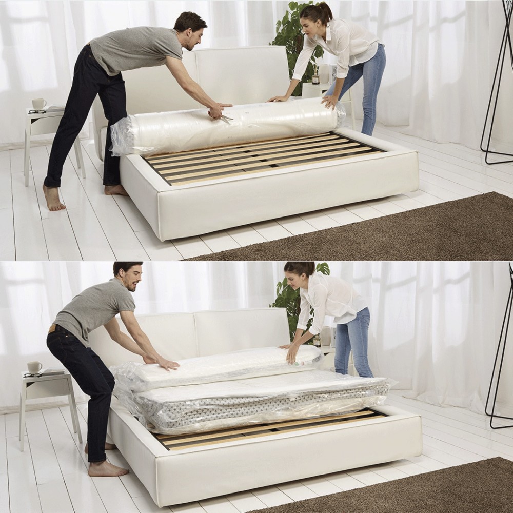 Матрасы поставляются в вакуумной упаковке скрученными в рулоны. Распаковывать матрас необходимо на плоской поверхности или непосредственно на основании кровати. После распаковки матрасу требуется 24 часа, чтобы полностью набрать свою форму. Обязательно следуйте инструкции по распаковке матраса во избежании механических повреждений.
