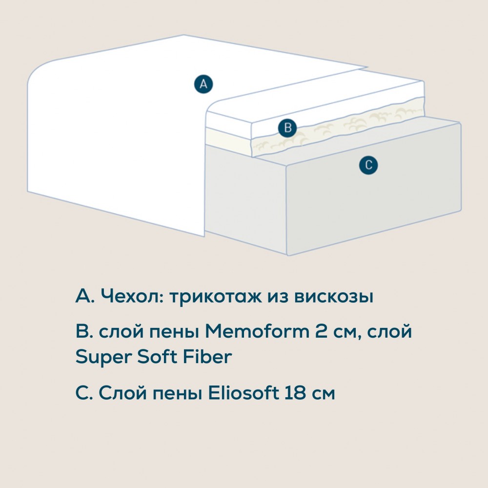Матрас «Magni 9» обладает жесткой и средней по жесткости сторонами. Высота матраса составляет 23 см. Основа матраса - слой пены Elioform (18 см). Это пена с самой высокой плотностью. Она отличается высокой ортопедичностью и упругостью. Эта сторона матраса жесткая. Далее идет слой комфорта. Это слой пены Memoform (2 см) и слой волокна Super Soft Fiber. Пена Memoform придает дополнительную мягкость матрасу. Волокно Super Soft Fiber создает супер мягкую дышащую прослойку. Эта сторона матраса обладает средней жесткостью.