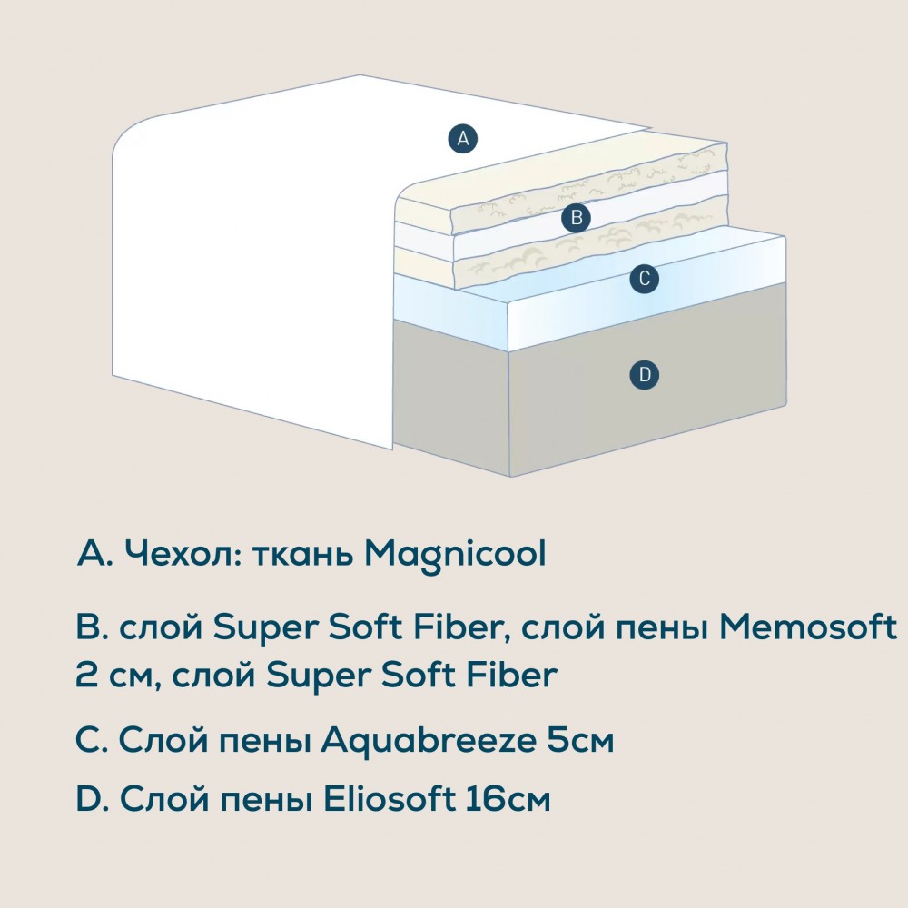 Матрас «Magnicool» из премиальной коллекции итальянского бренда Magniflex отличается мягкой степенью поддержки и уникальным охлаждающим чехлом. Это беспружинный матрас высотой 25 см. Основу матраса составляет слой пены Eliosoft (16 см). Эта пена обеспечивает мягкую комфортную поддержку спины. Далее идет слой пены Aquabreeze (5 см). Это эластичная пена высокой плотности. Структура пены имеет открытые ячейки. Благодаря этому воздух легко циркулирует, не позволяя накапливаться излишнему теплу и влаге.