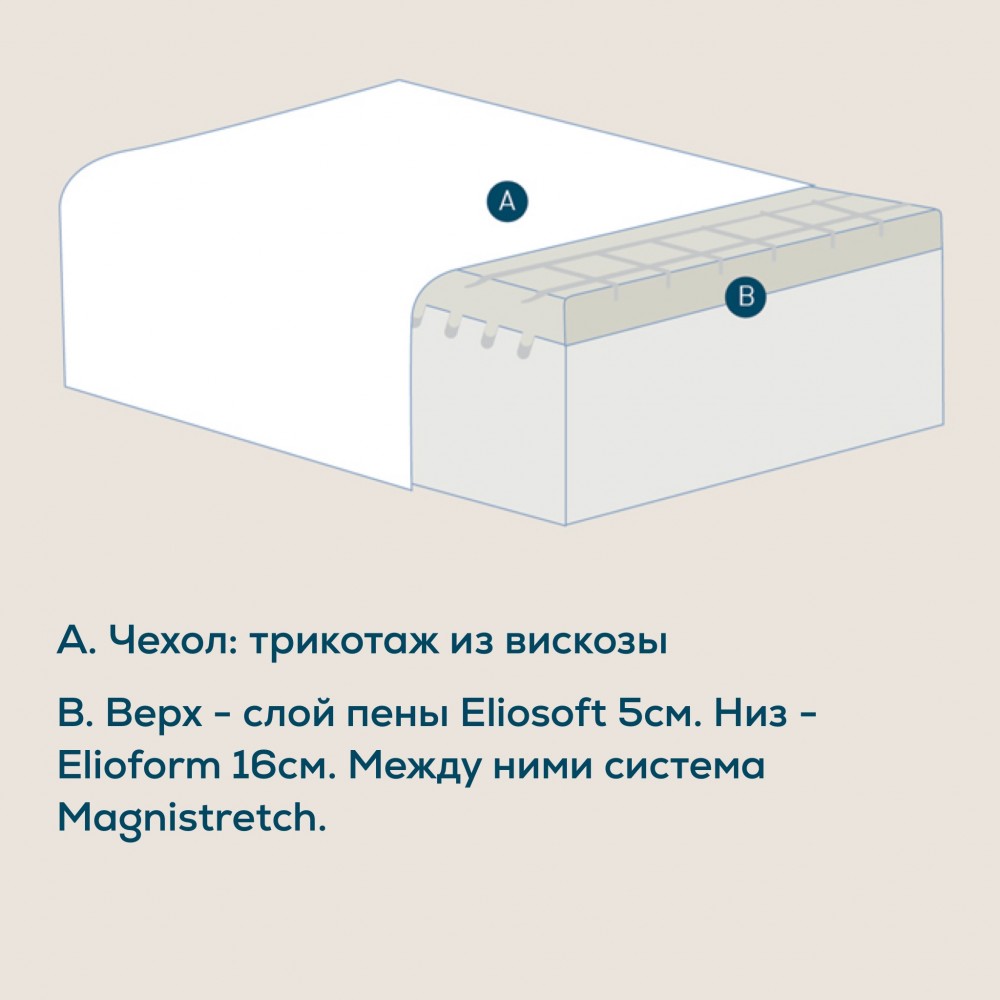Матрас «Magnistretch Sport 9» - это беспружинный матрас со степенью жесткости выше средней (умеренно жесткий). Высота матраса составляет 23 см. Основа матраса - слой пены Elioform (16 см). Это слой с самой высокой плотностью, обладает средней жесткостью и высокой ортопедичностью. С этим слоем с помощью системы Magnistretch соединен слой из пены Eliosoft высотой 5 см.