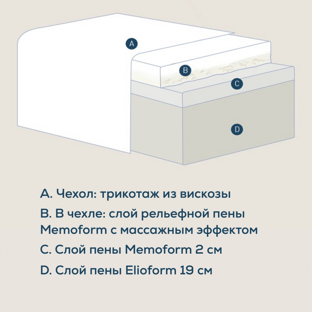 Матрас «Massaggio Deluxe» - это беспружинный матрас со степенью жесткости выше средней. Высота матраса составляет 25 см. Основа матраса - слой пены Elioform (19 см). Это пена с самой высокой плотностью, обладает высоким уровнем ортопедичности и упругости. Далее идет слой пены Memoform (2 см). Пена Memoform является одной из самых мягких и обладает эффектом памяти формы. Она «запоминает» изгибы вашего тела, позволяя достичь максимального расслабления мышц.