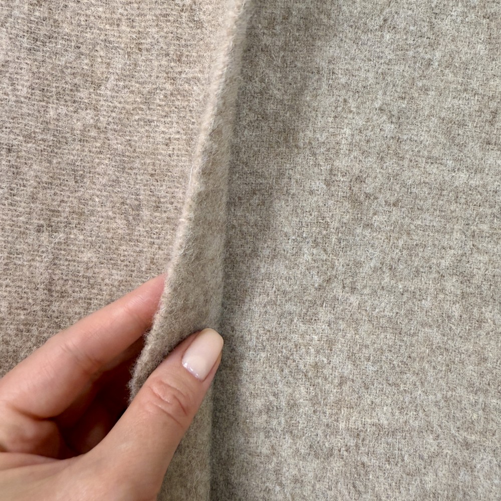 Акцент в пледах «Milda» сделан на фактуру и сочетание оттенков шерсти. В пледах использована пряжа двух цветов. Одна сторона пледа выполнена в розовато-бежевом оттенке. Она менее "пушистая", с более выраженной фактурой плетения. Другая сторона дымчато-бежевого оттенка. Она более "пушистая". Такой дизайн подчеркивает красоту натуральной шерсти. Завершают плед кисти с двух сторон (по узким сторонам пледа).