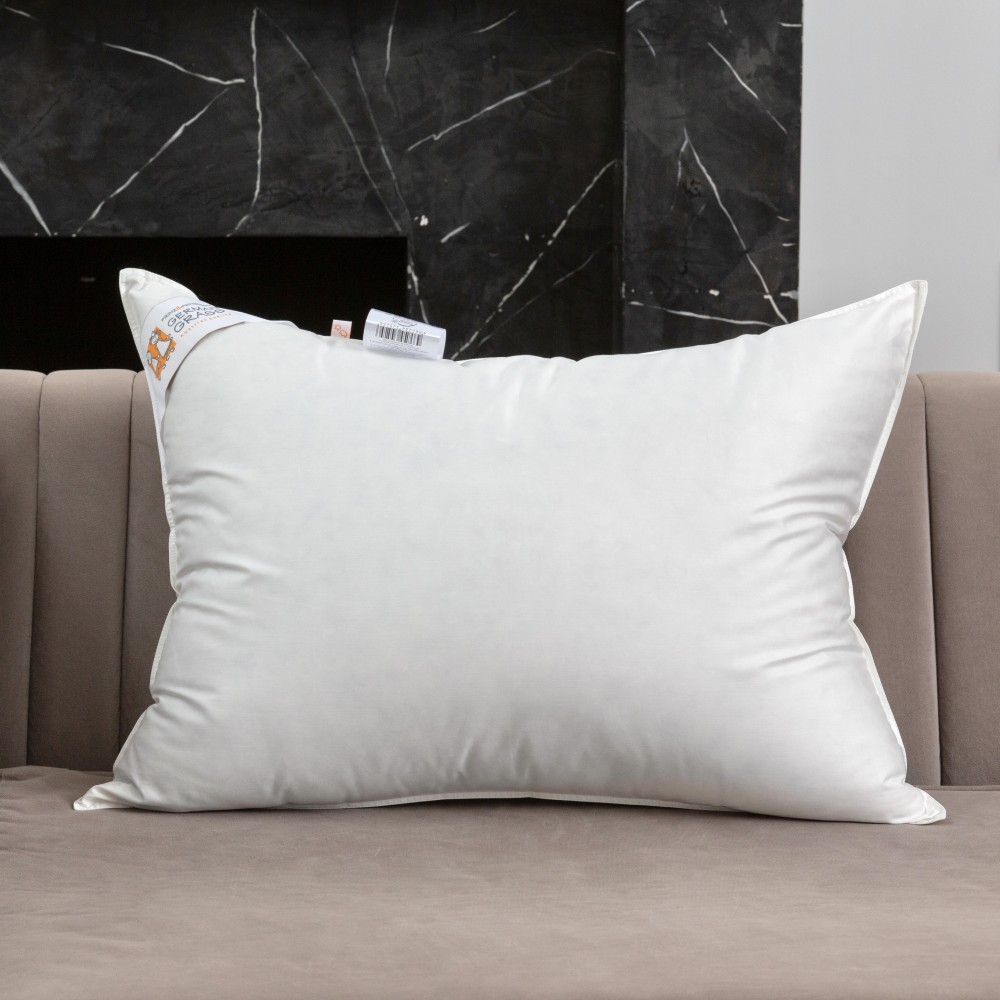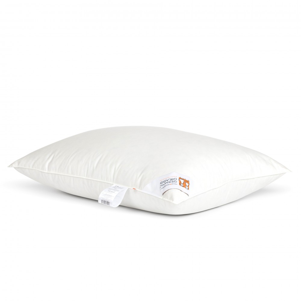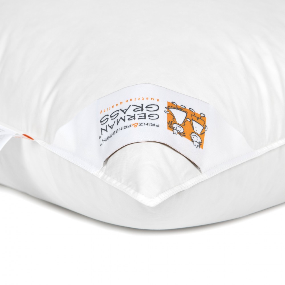 Детская пуховая подушка «Kinder Platinum Grass»; степень поддержки: мягкая; размер: 50х68 см; наполнитель: 100% серый гусиный пух; чехол: сатин пуходержащий, 60% тенсель, 40% хлопок.
