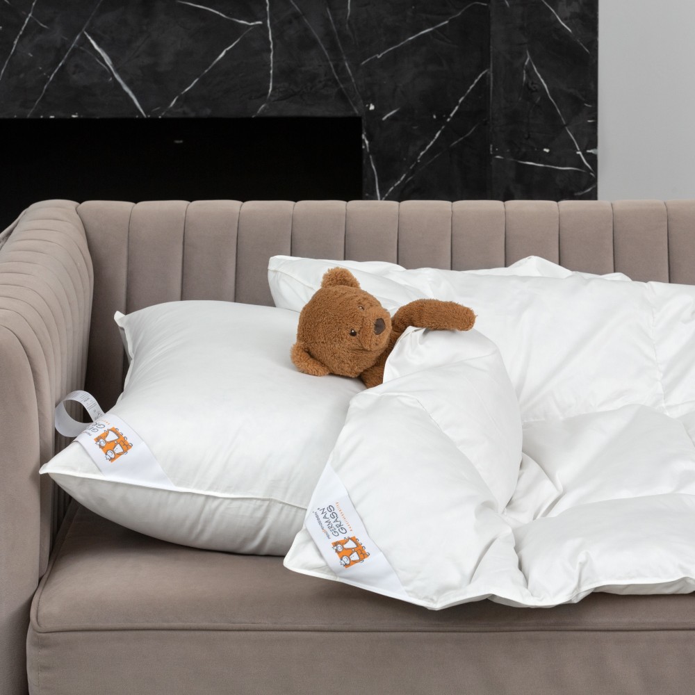 Детские пуховые одеяла и подушки из коллекции «Kinder Platinum Grass» наполнены 100% серым гусиным пухом. Это отборный, практически невесомый пух высшей категории с коэффициентом упругости не менее 700FP. Пух в этой коллекции по свои свойствам не уступает белому гусиному пуху. Только цвет пушинок выдает в нем пух от серых гусей. Благодаря такому высокому качеству наполнителя постельные принадлежности получились легкими, воздушными и прекрасно справляются со своей задачей.