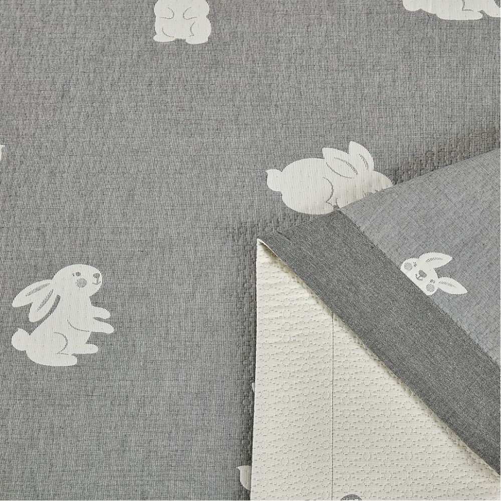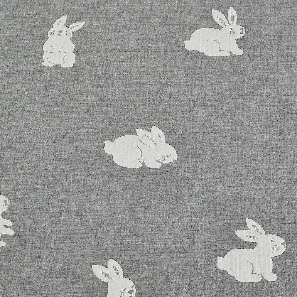 Покрывало «Кролики» выполнено в серо-молочной гамме и украшено кроликами. Одна сторона выполнена в сером оттенке с молочными кроликами, а на другой стороне будут серые кролики на молочном фоне. С серой стороны край покрывала завершает широкая кайма с евроуглом.