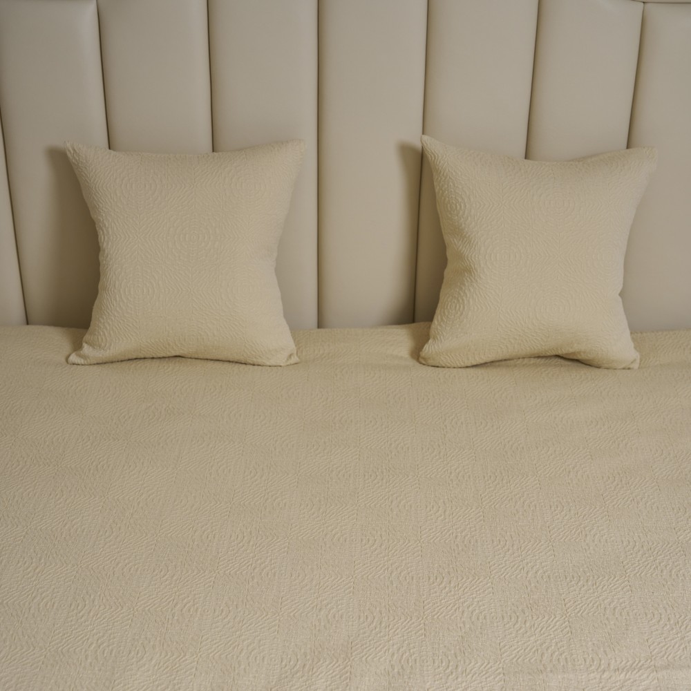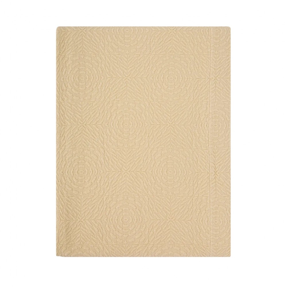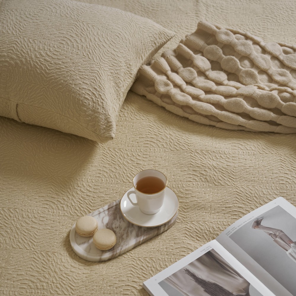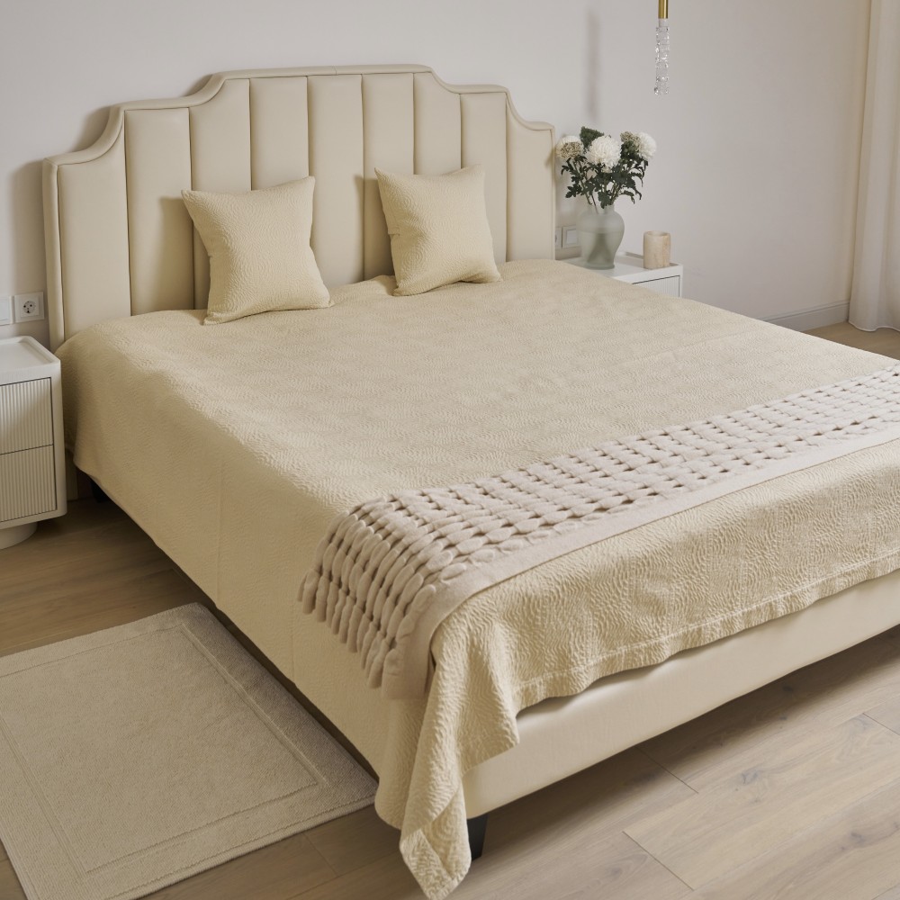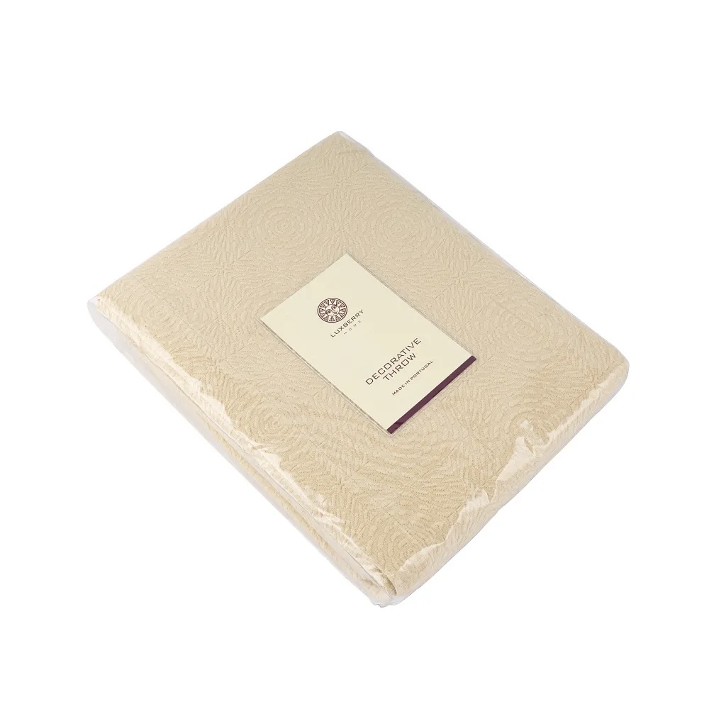 Покрывала португальского производства от бренда Luxberry - это всегда необычные интересные фактуры, благородные оттенки, отличный пошив и натуральный состав. Линейка покрывал «Solar» выполнена в теплом сливочно-бежевом оттенке. Фактура ткани напоминает керамическую плитку с узором, который собирается в розетки-солнца. Солнечный оттенок добавит тепла и света практически в любой интерьер. Покрывала будут хорошо смотреться и в заправленном виде и со свободным краем. С трех сторон край завершает аккуратная отстрочка, два угла в изножье оформлены лаконичным "евроуглом".