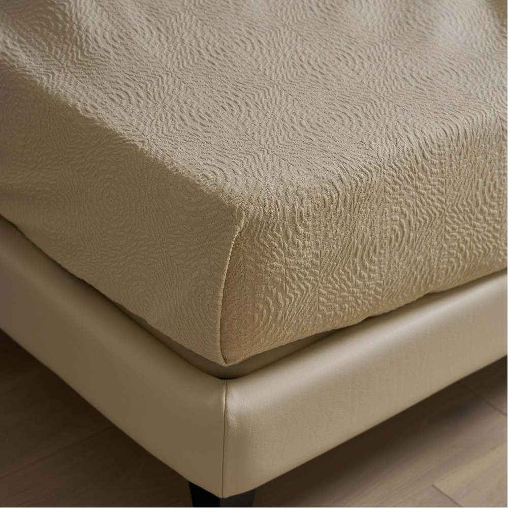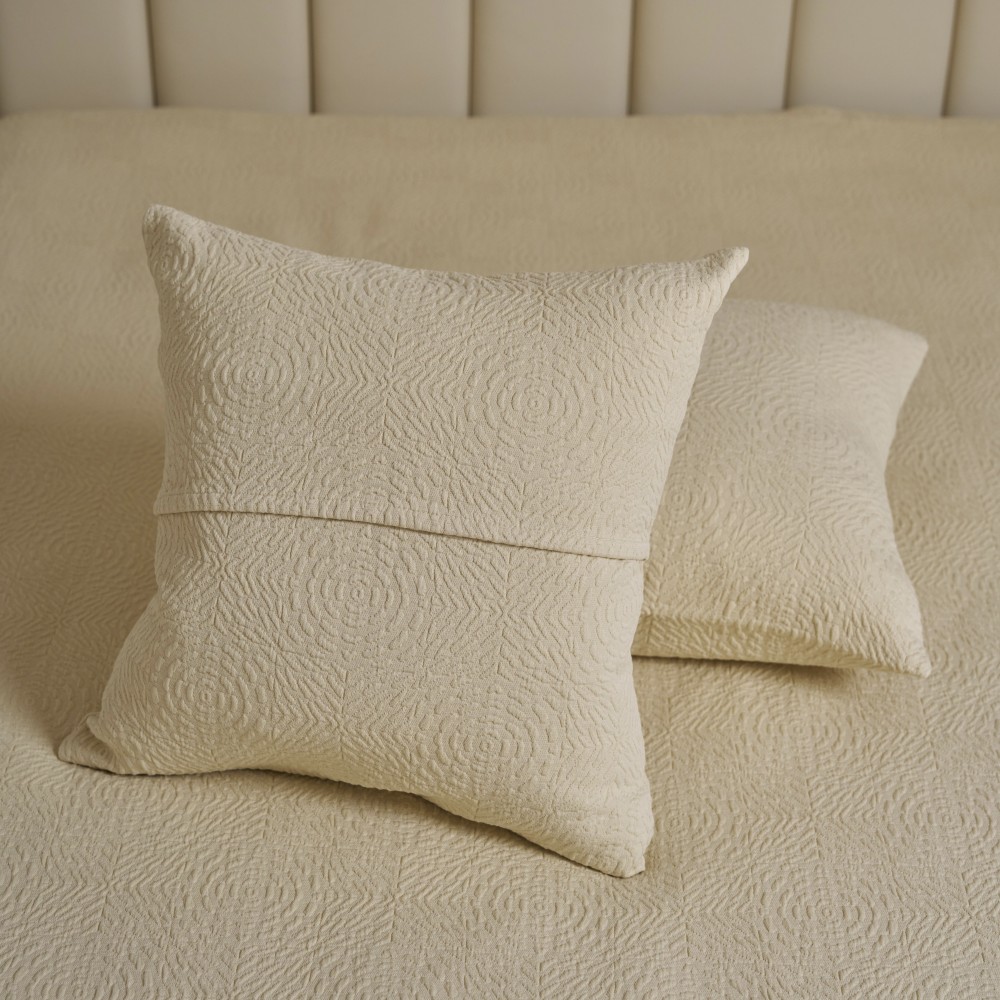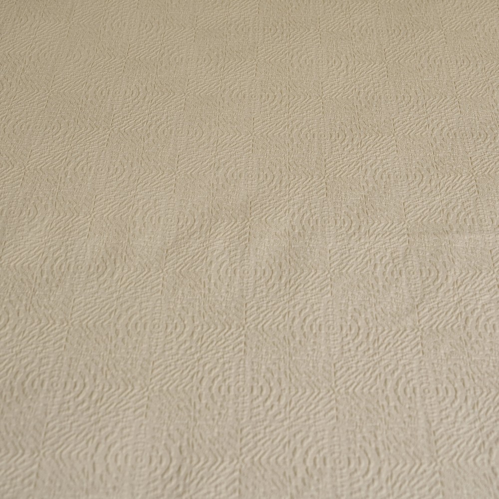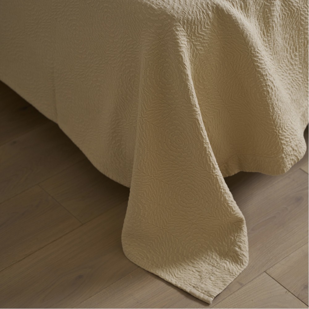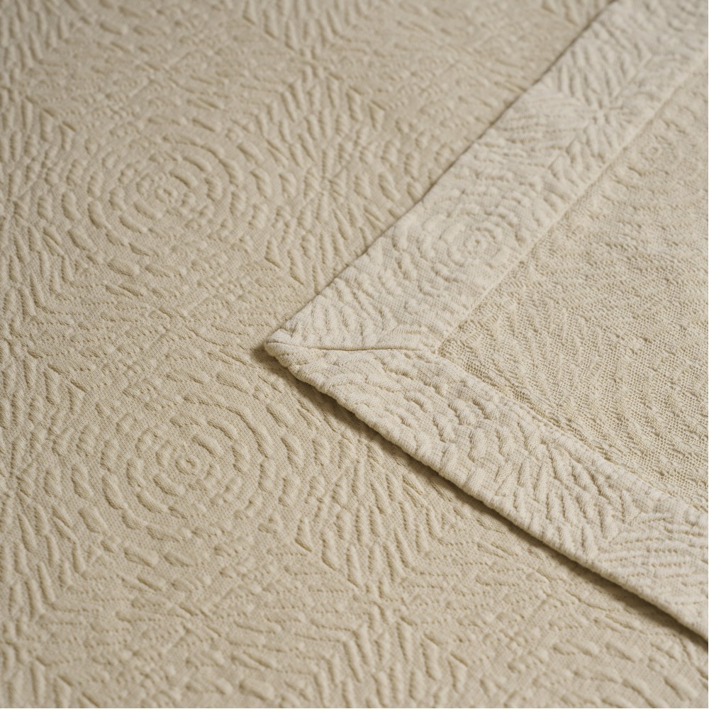 Покрывала португальского производства от бренда Luxberry - это всегда необычные интересные фактуры, благородные оттенки, отличный пошив и натуральный состав. Линейка покрывал «Solar» выполнена в теплом сливочно-бежевом оттенке. Фактура ткани напоминает керамическую плитку с узором, который собирается в розетки-солнца. Солнечный оттенок добавит тепла и света практически в любой интерьер. Покрывала будут хорошо смотреться и в заправленном виде и со свободным краем. С трех сторон край завершает аккуратная отстрочка, два угла в изножье оформлены лаконичным "евроуглом".