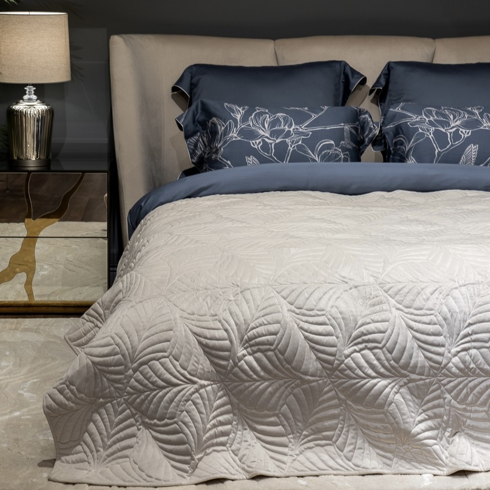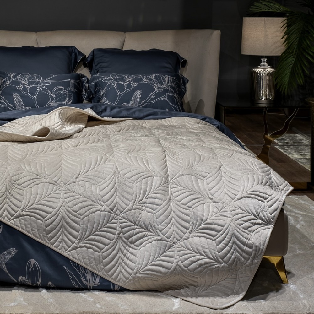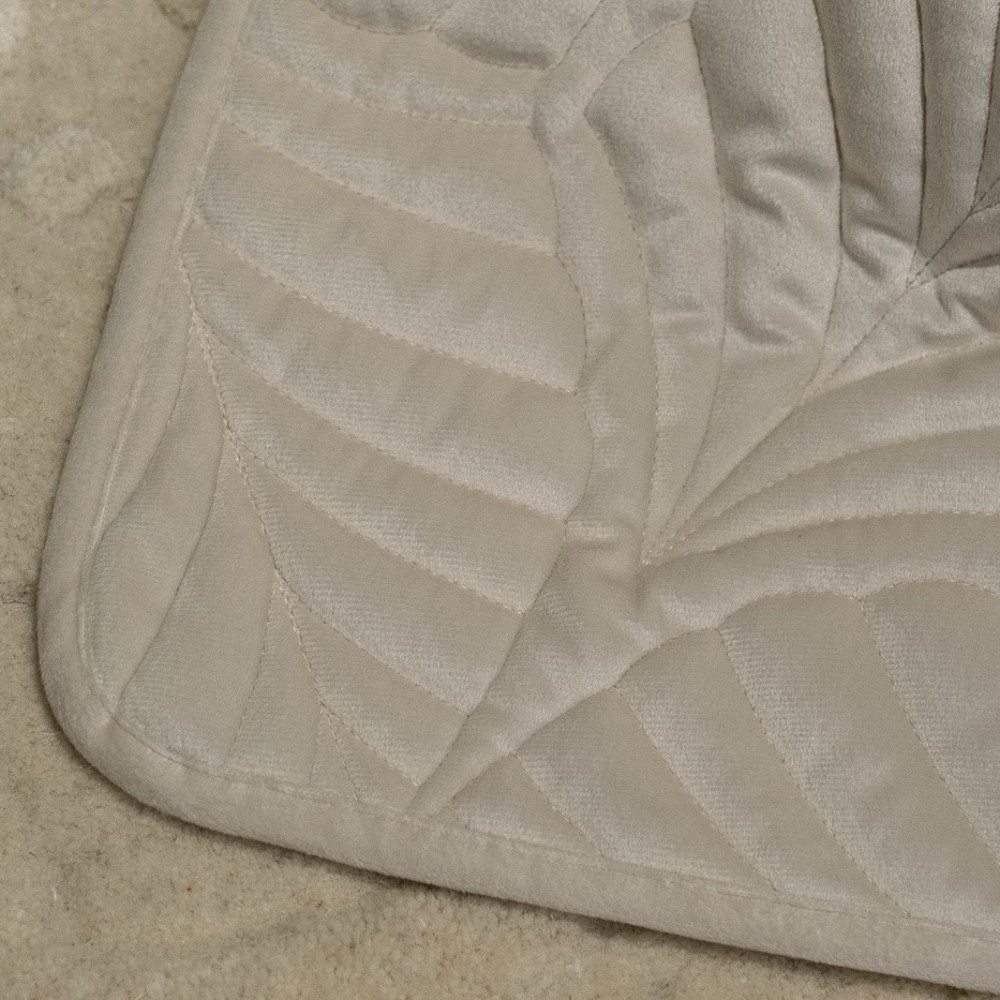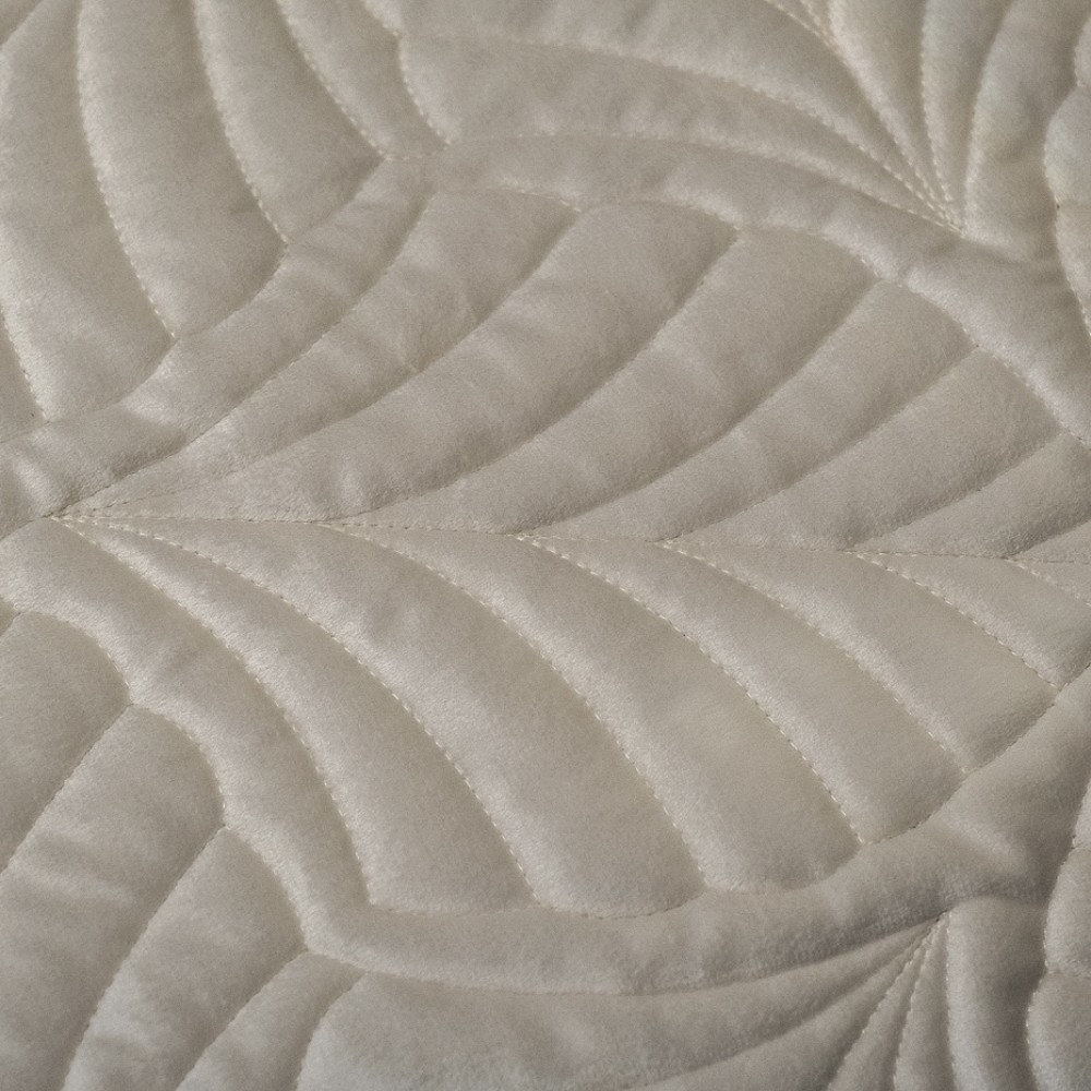 Стеганое покрывало «Флора» выполнено из нежного велюра в светло-бежевом оттенке. Стежка покрывала сделана в виде крупных пальмовых листьев. Спокойный оттенок, бархатистая фактура и фигурная стежка создают универсальное, при этом нескучное покрывало, которое будет актуально во многих интерьерах.