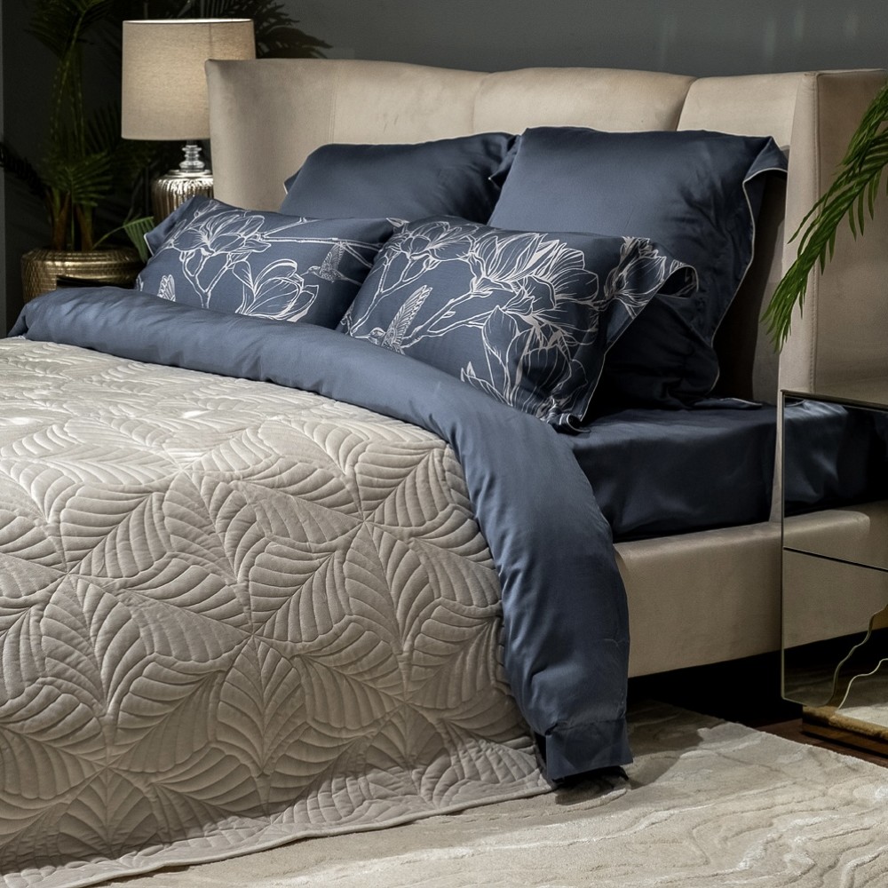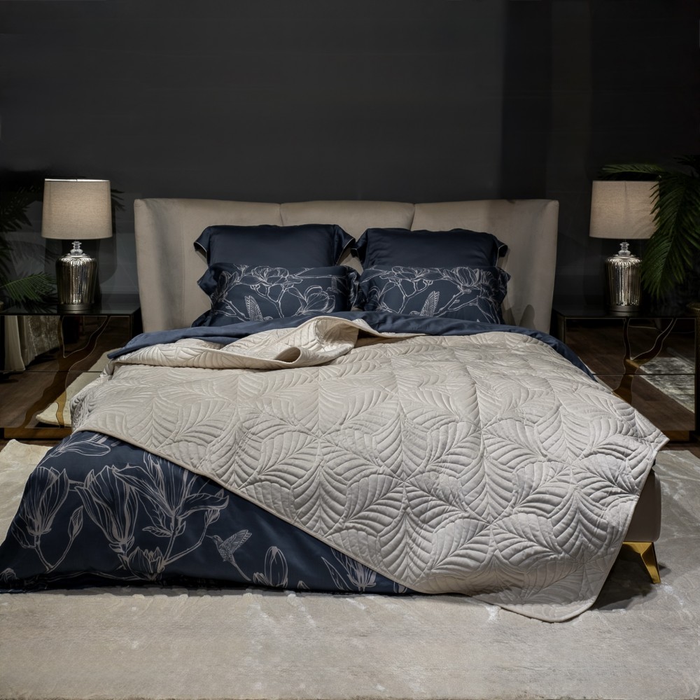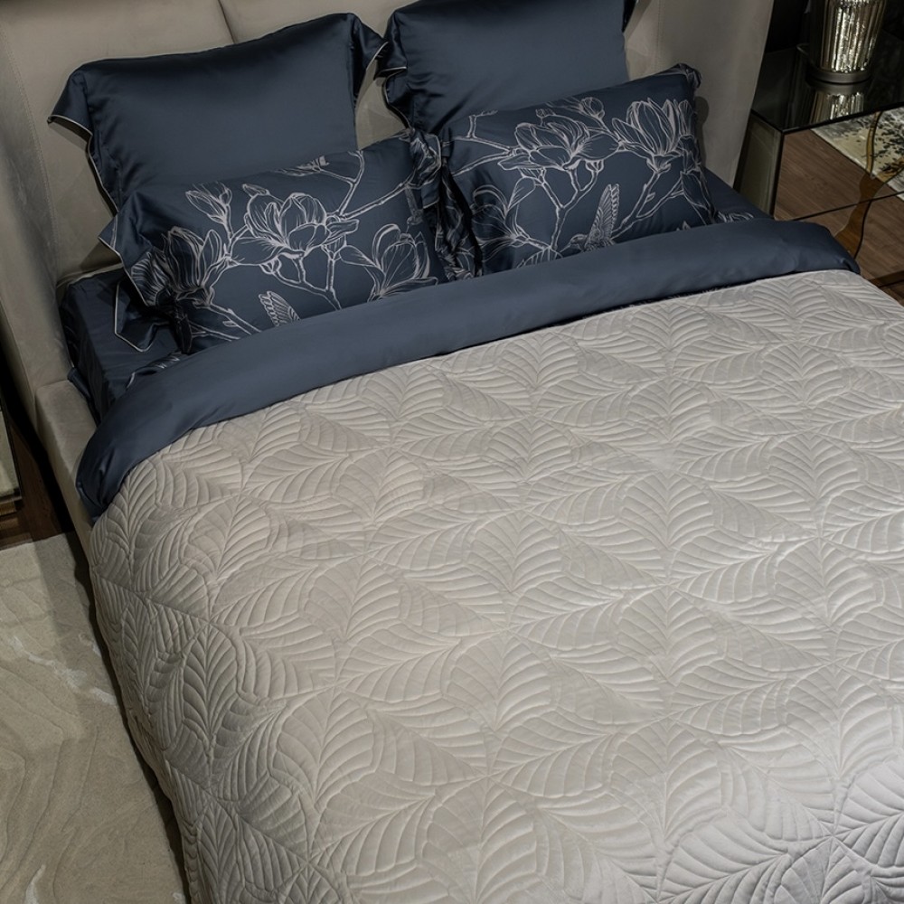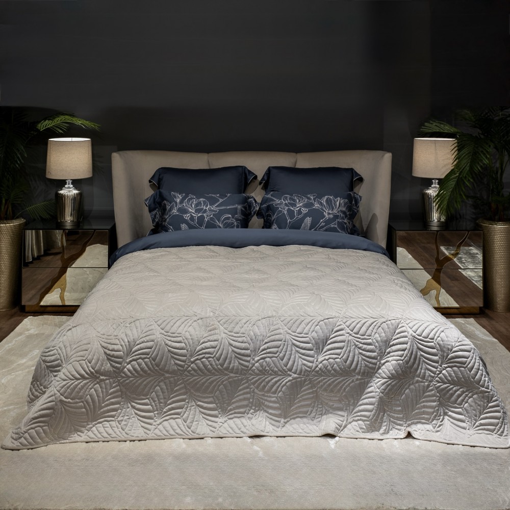 Стеганое покрывало «Флора» выполнено из нежного велюра в светло-бежевом оттенке. Стежка покрывала сделана в виде крупных пальмовых листьев. Спокойный оттенок, бархатистая фактура и фигурная стежка создают универсальное, при этом нескучное покрывало, которое будет актуально во многих интерьерах.