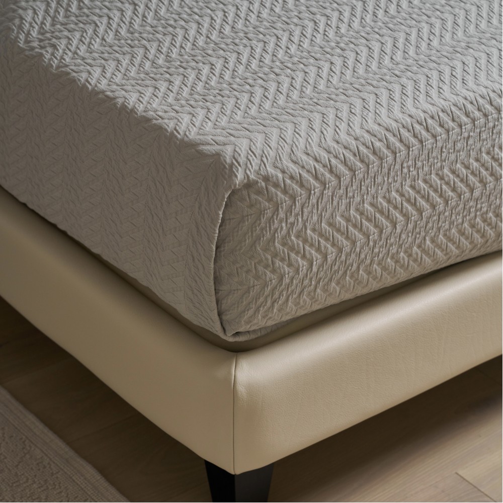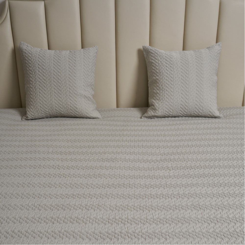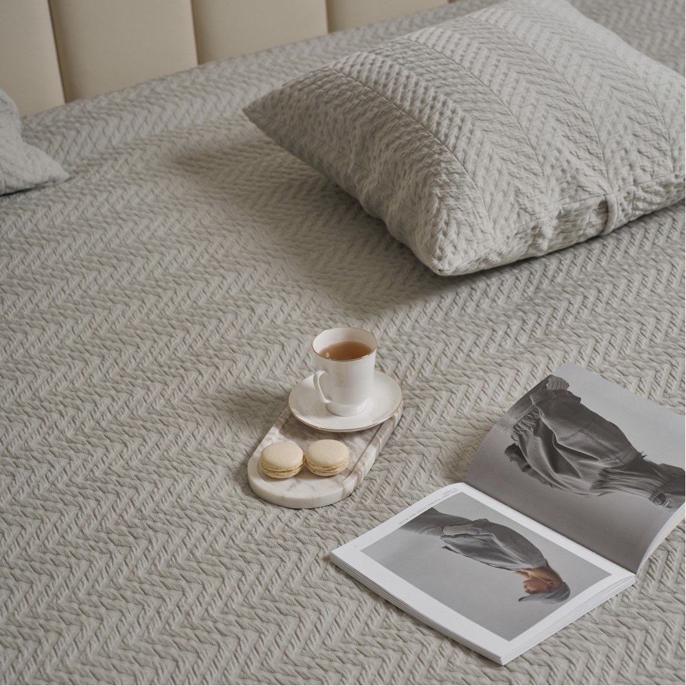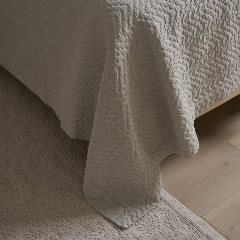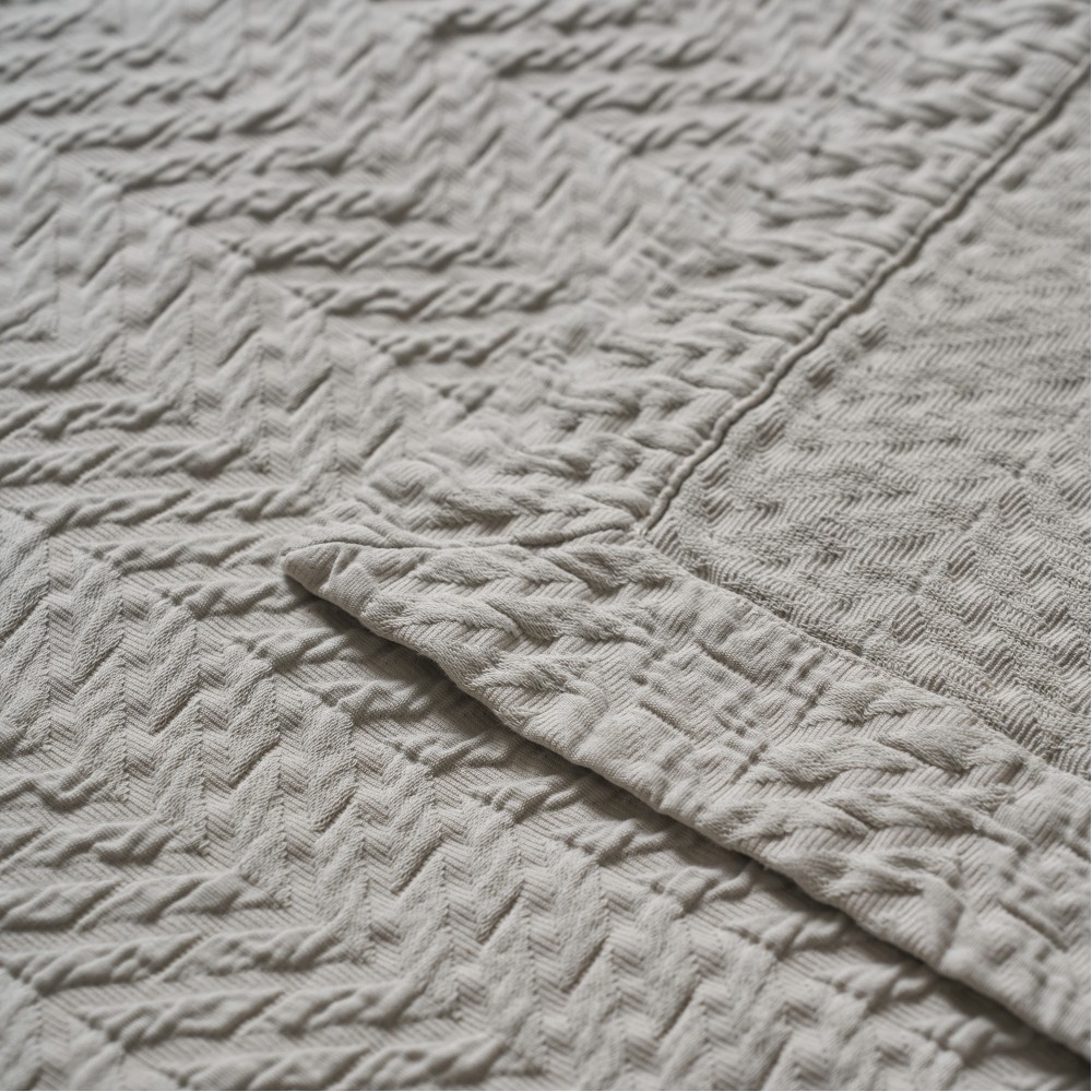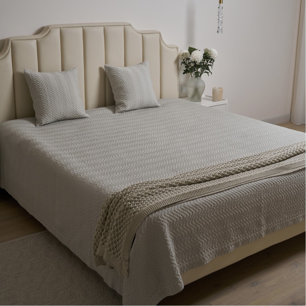 Покрывала португальского производства от бренда Luxberry - это всегда необычные интересные фактуры, благородные оттенки, отличный пошив и натуральный состав. Линейка покрывал «Ziggy» выполнена в сером оттенке с легким фисташковым подтоном. Фактура покрывала - классическая елочка. Благодаря особой выработке ткани узор объемный, с несколькими текстурами. Ткань плотная, при этом пластичная. Покрывала будут хорошо смотреться и в заправленном виде и со свободным краем. С трех сторон край завершает аккуратная отстрочка, два угла в изножье оформлены лаконичным "евроуглом".