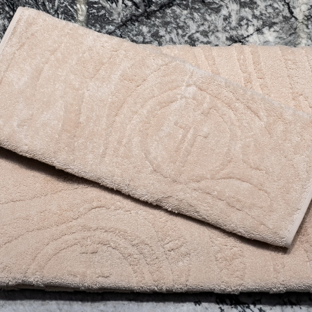 Махра в полотенцах «Флавио» текстурированная. За счет разной высоты петель на полотенцах получился рисунок в виде логотипа бренда.