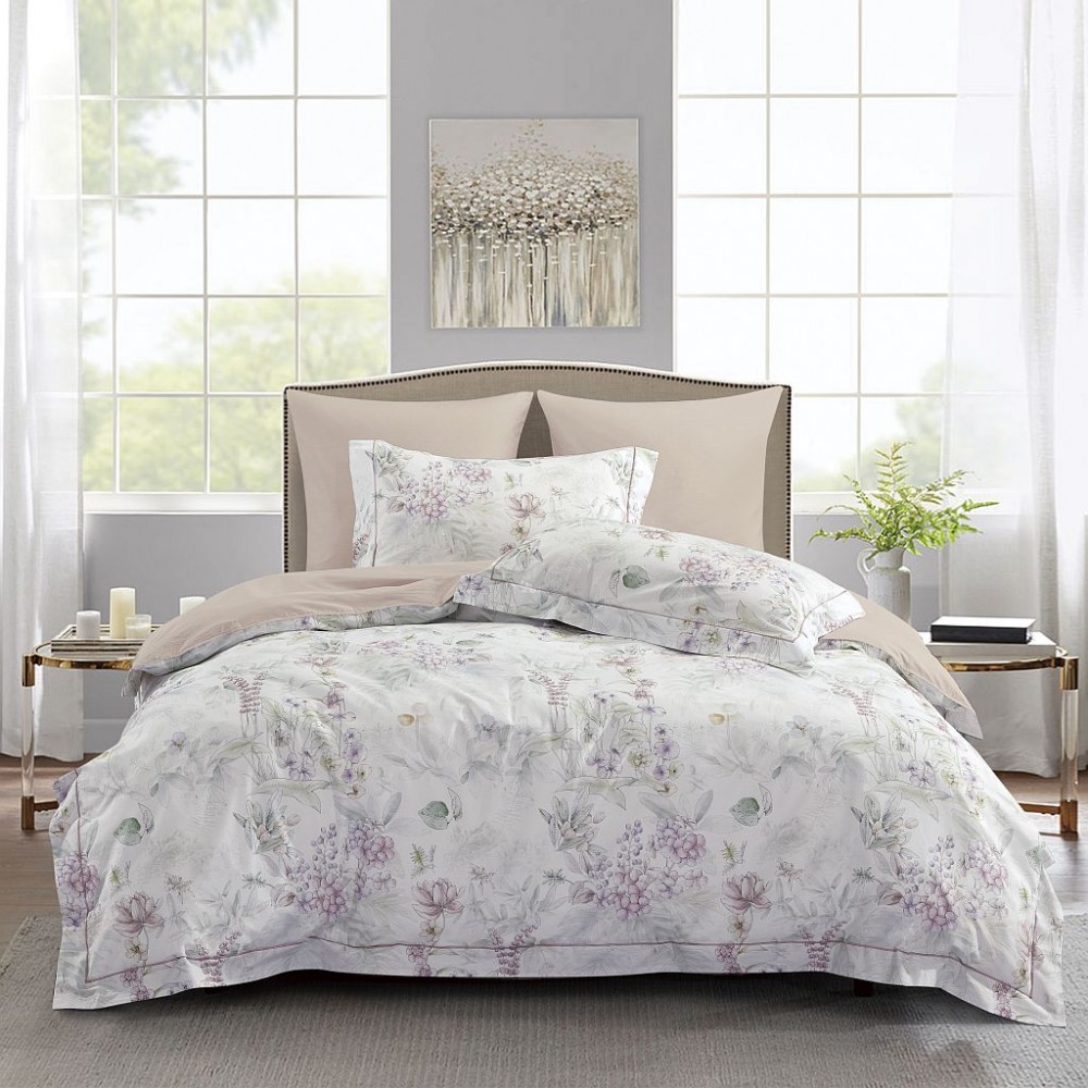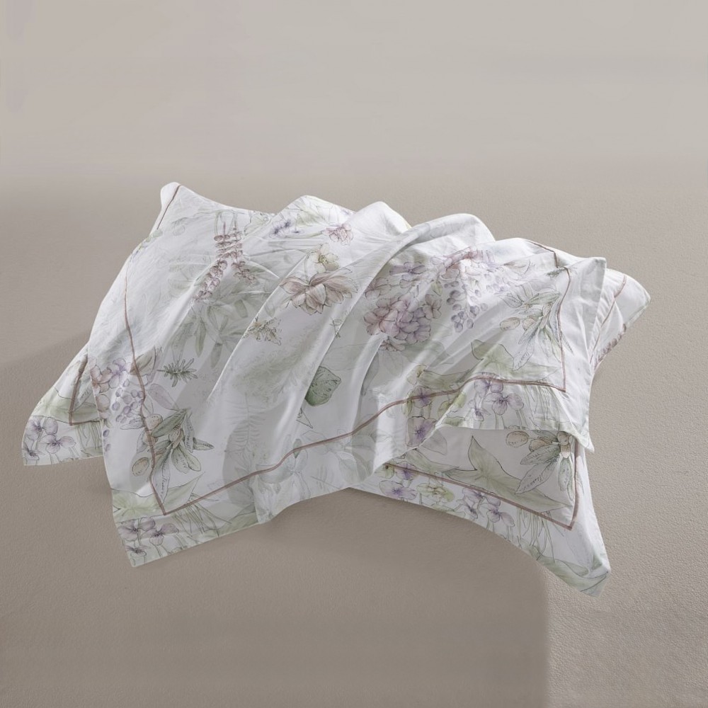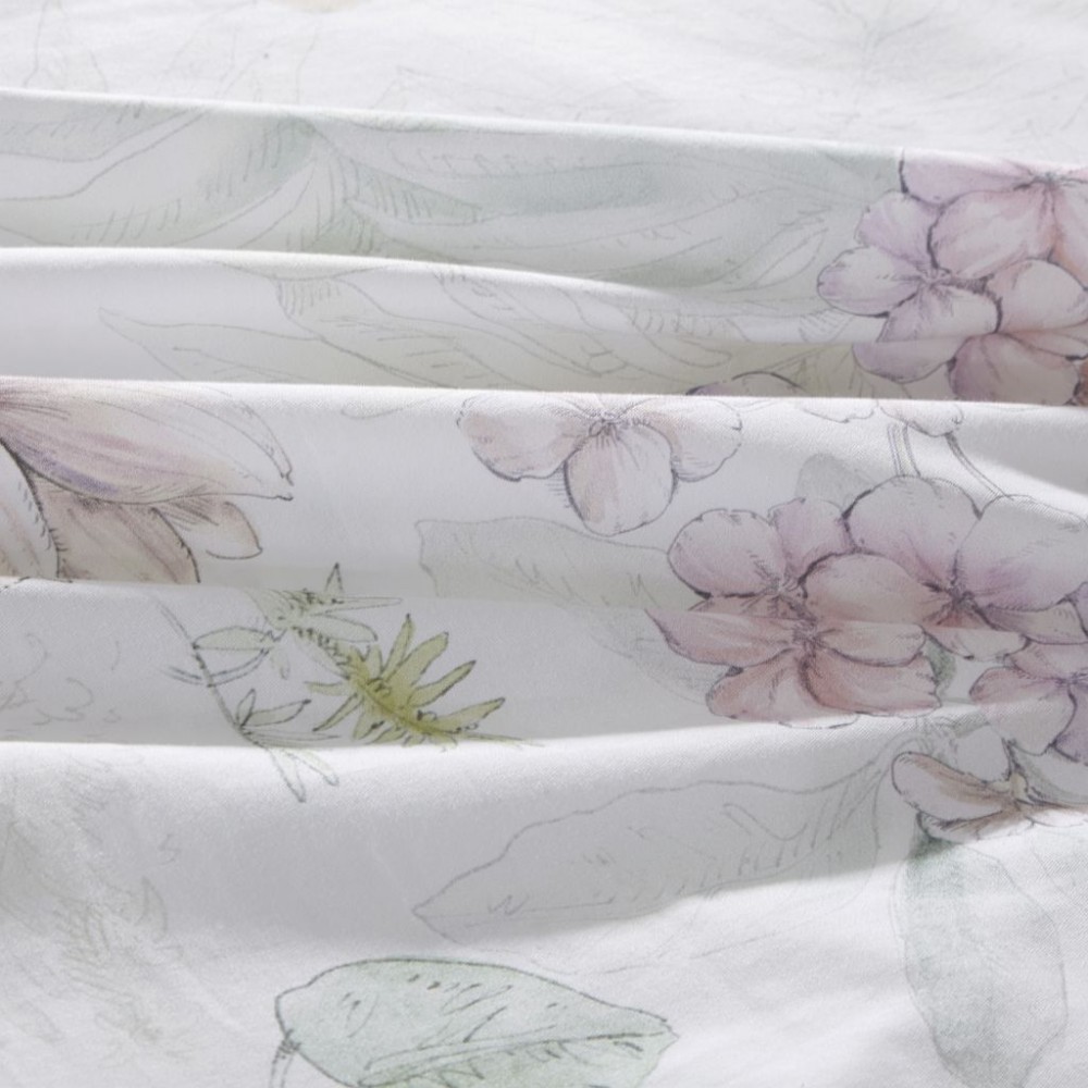 Внешняя сторона пододеяльников и наволочки в размере 50х70 см украшены цветочным принтом. Обратная сторона пододеяльников, простыни и наволочки в размере 70х70 см выполнены из однотонной ткани-компаньона.