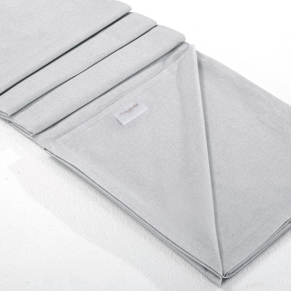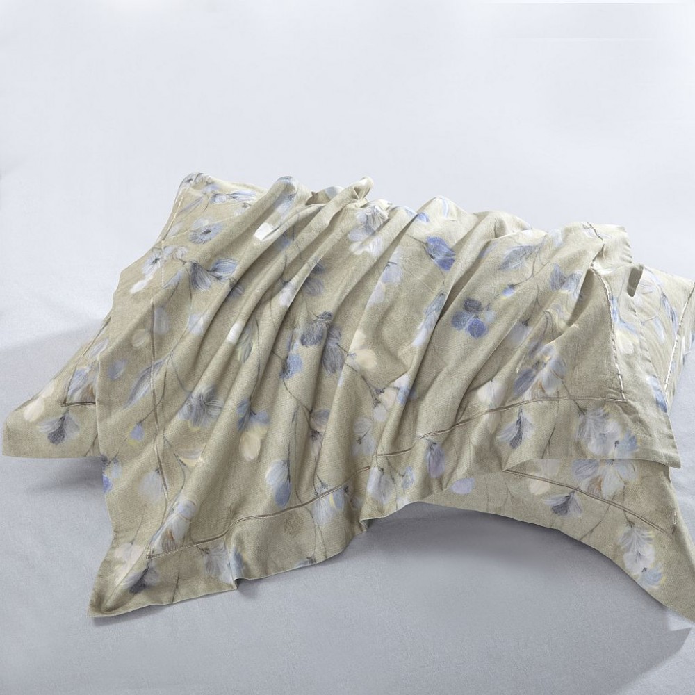 Внешняя сторона пододеяльников и наволочки в размере 50х70 см выполнены из ткани с принтом. Обратная сторона пододеяльников, простыни и наволочки в размере 70х70 см выполнены из ткани-компаньона с меланжевым эффектом.