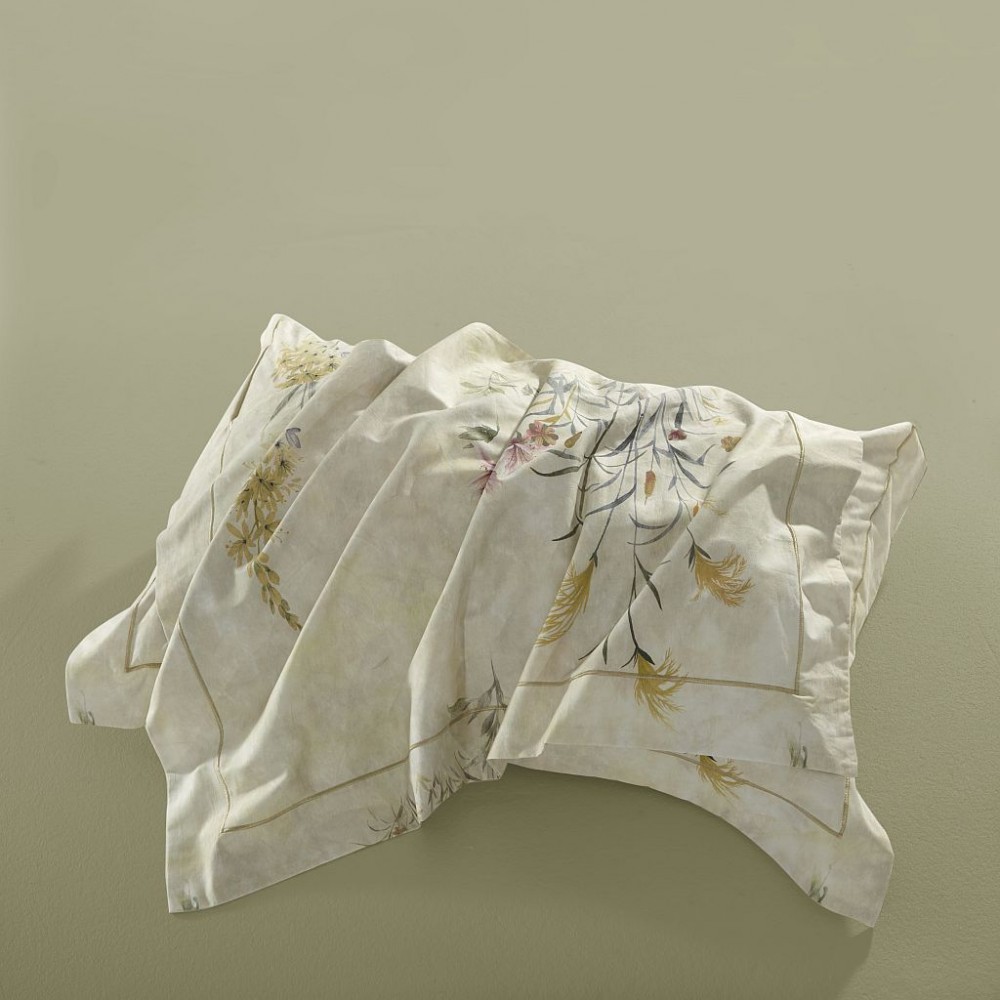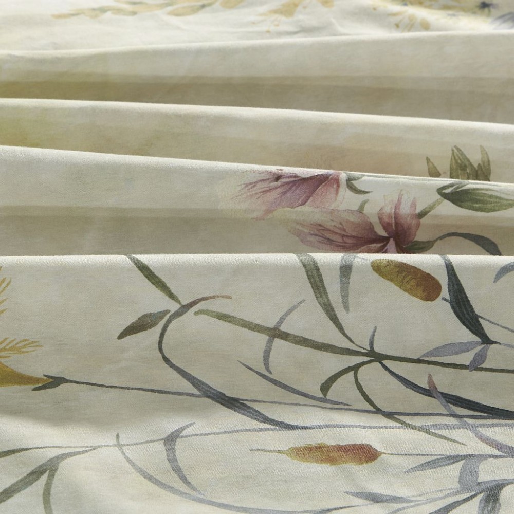 Внешняя сторона пододеяльников и наволочки в размере 50х70 см украшены цветочным принтом. Обратная сторона пододеяльников, простыни и наволочки в размере 70х70 см выполнены из однотонной ткани-компаньона.