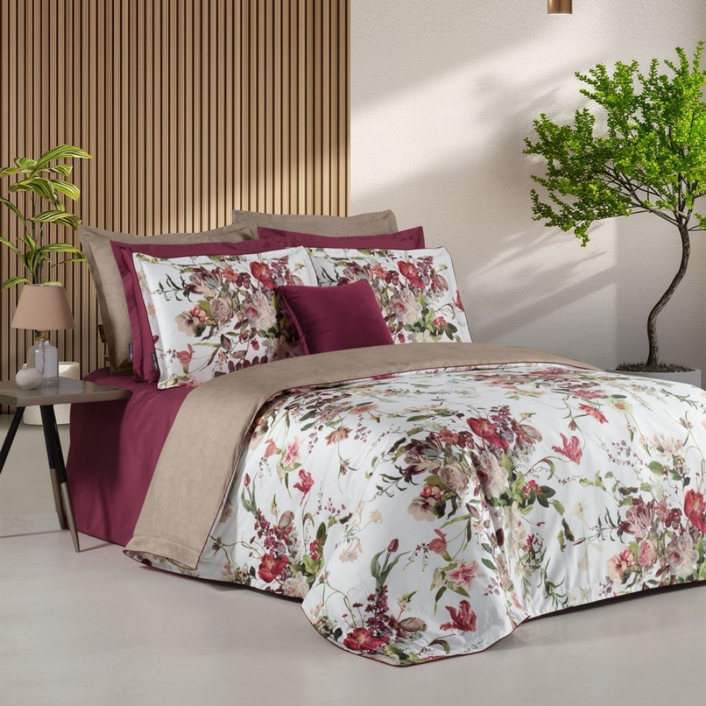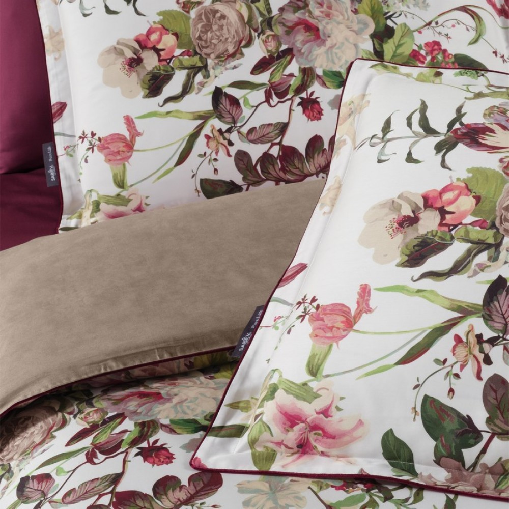 В дизайне постельного белья «Bella Rose» использованы три дополняющих друг друга ткани. Основная ткань выполнена в белом цвете и украшена фантастически красивыми пионами, розами, тюльпанами. Вторая ткань с меланжевым эффектом в оттенке капучино. И третья ткань-компаньон однотонная в шикарном оттенке бургунди. Внешняя сторона пододеяльников и одной пары наволочек выполнена из основной ткани. Обратная сторона - из второй ткани в оттенке капучино. Простыни и вторая пара наволочек выполнены из ткани-компаньона в цвете бургунди.