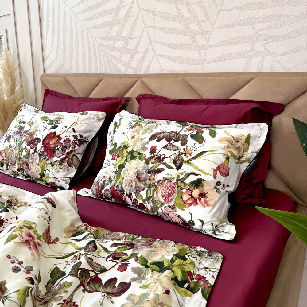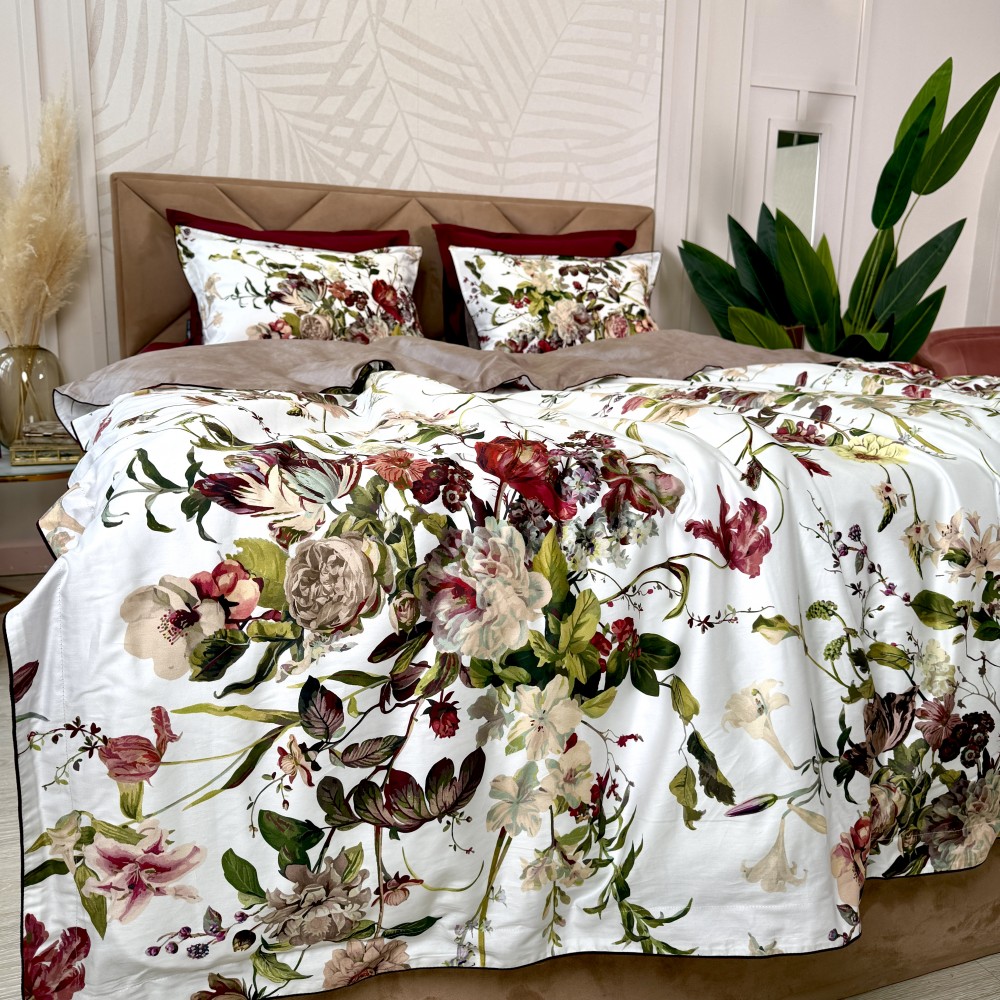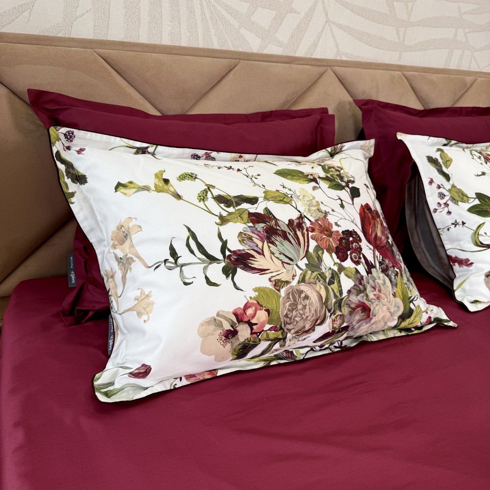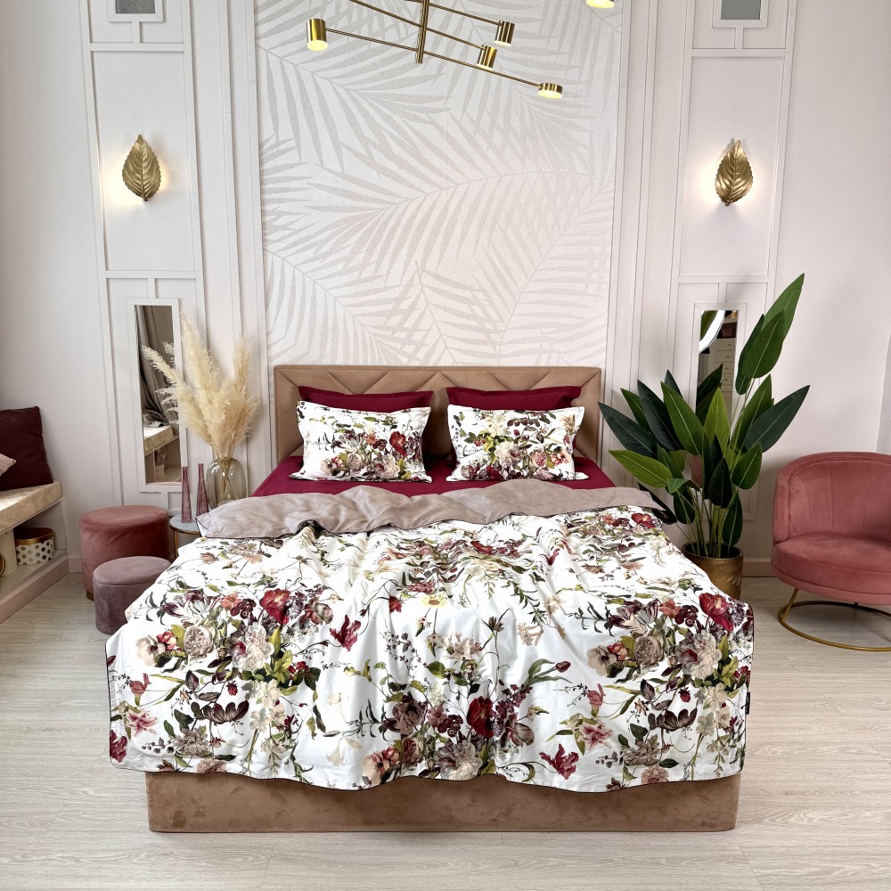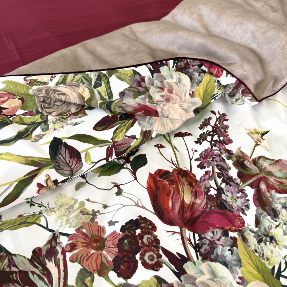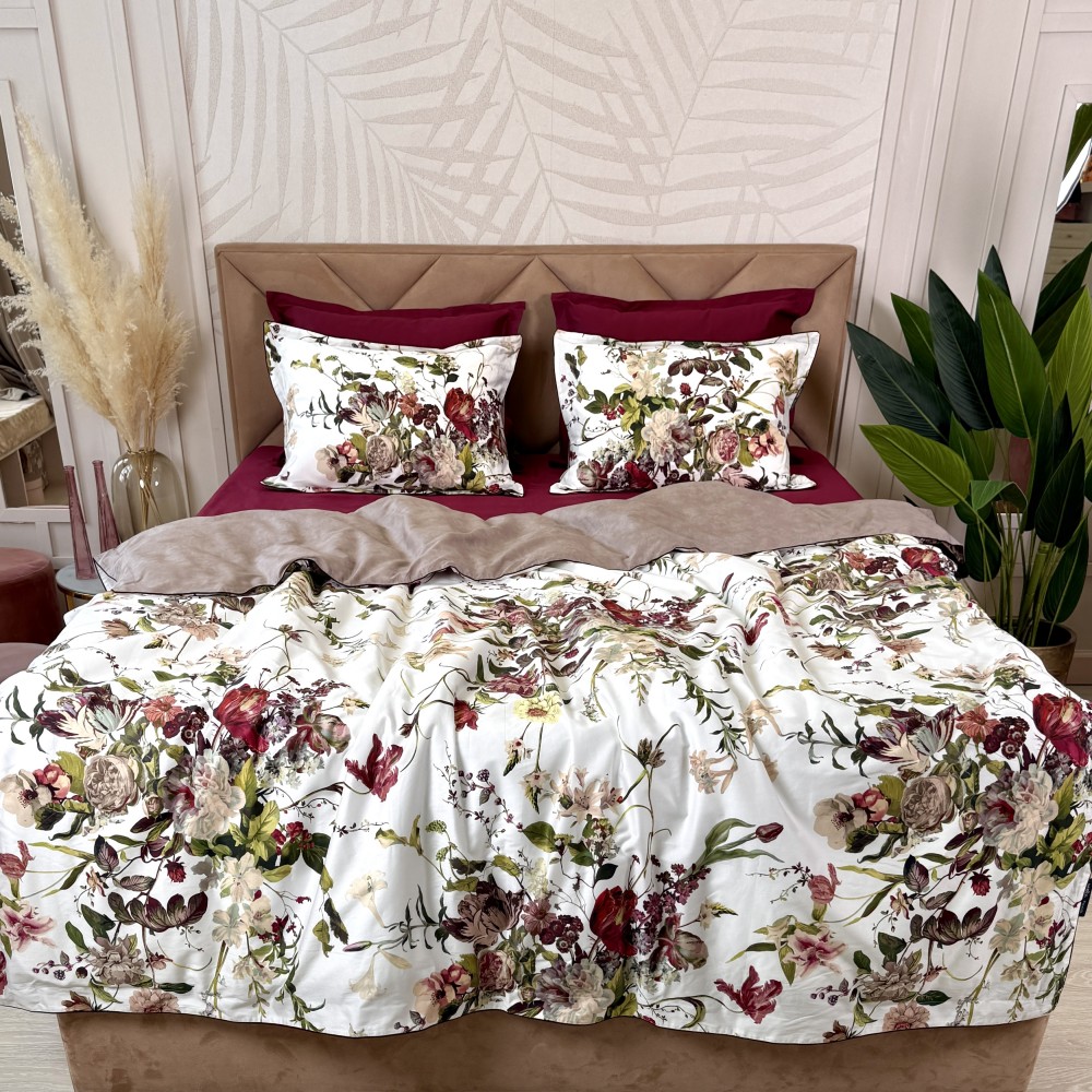 В дизайне постельного белья «Белла Роуз» использованы три дополняющих друг друга ткани. Основная ткань выполнена в белом цвете и украшена фантастически красивыми пионами, розами, тюльпанами. Вторая ткань с меланжевым эффектом в оттенке капучино. И третья ткань-компаньон однотонная в шикарном оттенке бургунди. Внешняя сторона пододеяльников и одной пары наволочек выполнена из основной ткани. Обратная сторона - из второй ткани в оттенке капучино. Простыни и вторая пара наволочек выполнены из ткани-компаньона в цвете бургунди.