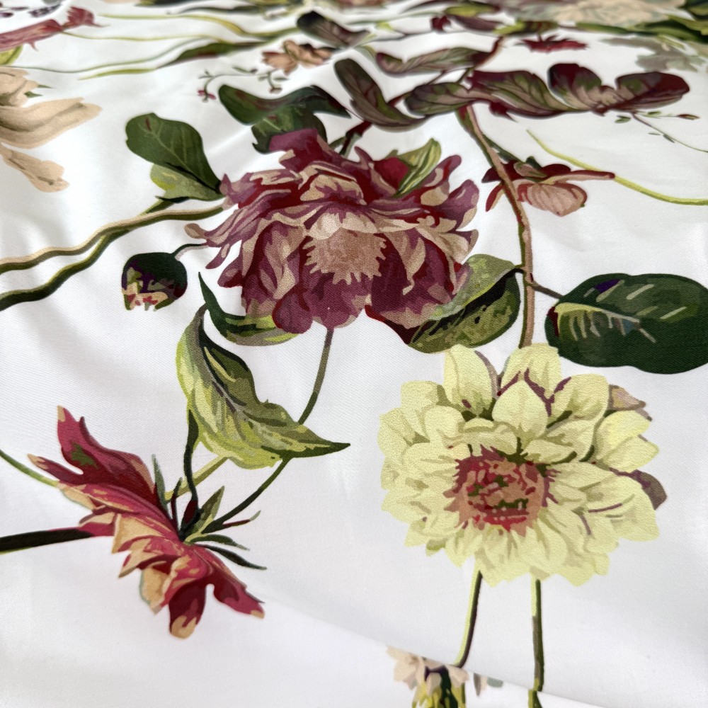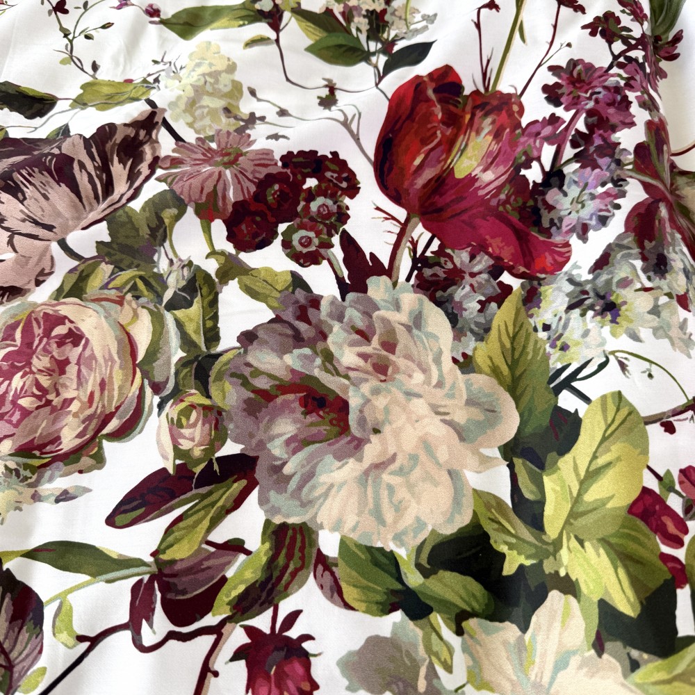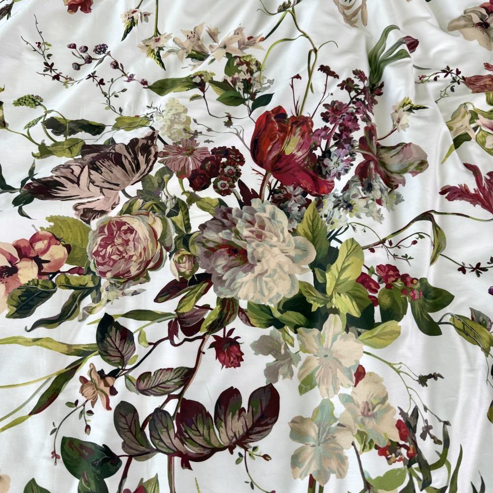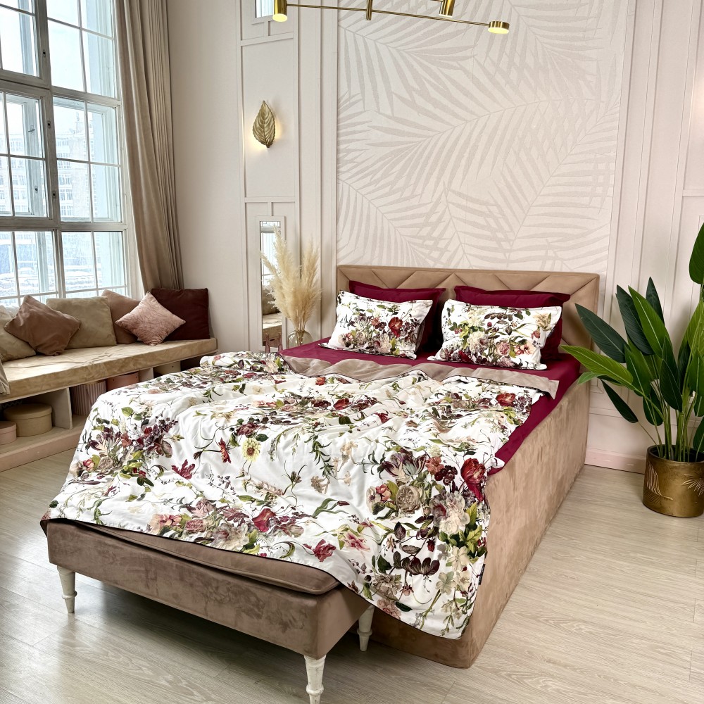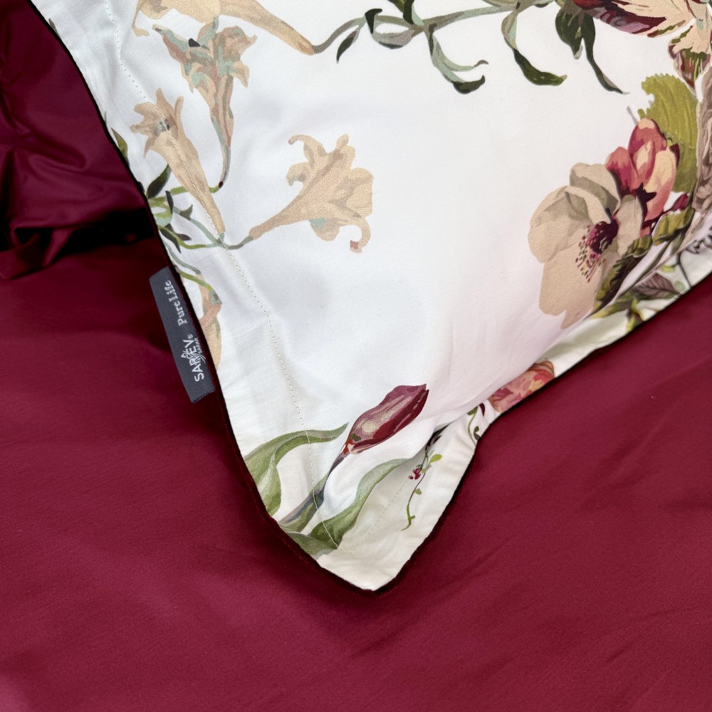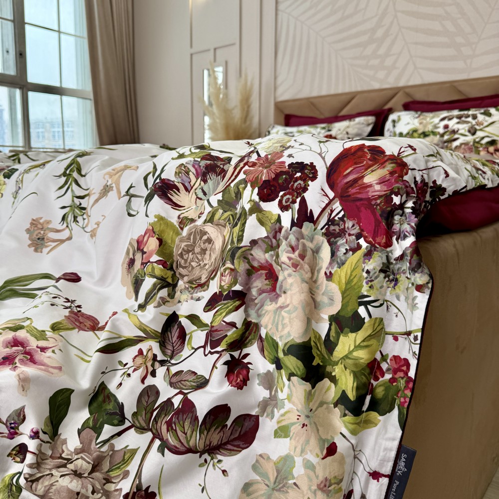 В дизайне постельного белья «Белла Роуз» использованы три дополняющих друг друга ткани. Основная ткань выполнена в белом цвете и украшена фантастически красивыми пионами, розами, тюльпанами. Вторая ткань с меланжевым эффектом в оттенке капучино. И третья ткань-компаньон однотонная в шикарном оттенке бургунди. Внешняя сторона пододеяльников и одной пары наволочек выполнена из основной ткани. Обратная сторона - из второй ткани в оттенке капучино. Простыни и вторая пара наволочек выполнены из ткани-компаньона в цвете бургунди.