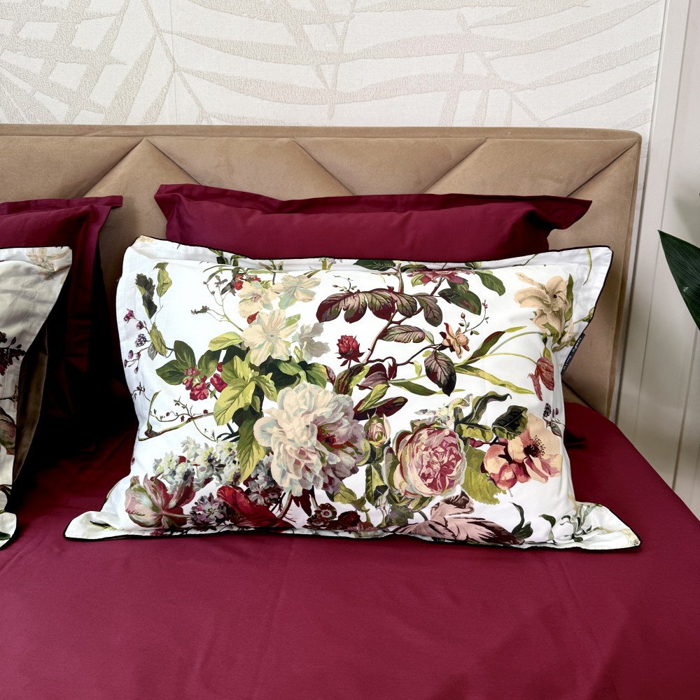 Вход в пододеяльники расположен внизу, закрывается на пуговицы, скрытые в клапане. Все наволочки в комплекте идут в размере 50х70 см. Выполнены в оксфордском дизайне (с "ушками" по периметру). Ушки основных наволочек и пододеяльник декорированы темно-бордовым бархатным кантом. Ушки у наволочек не широкие, они отлично держат форму и стоят без дополнительных усилий. Наволочки закрываются методом запаха. Простыни в комплектах свободные (прямые).