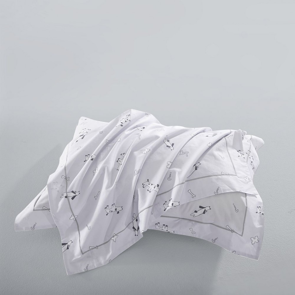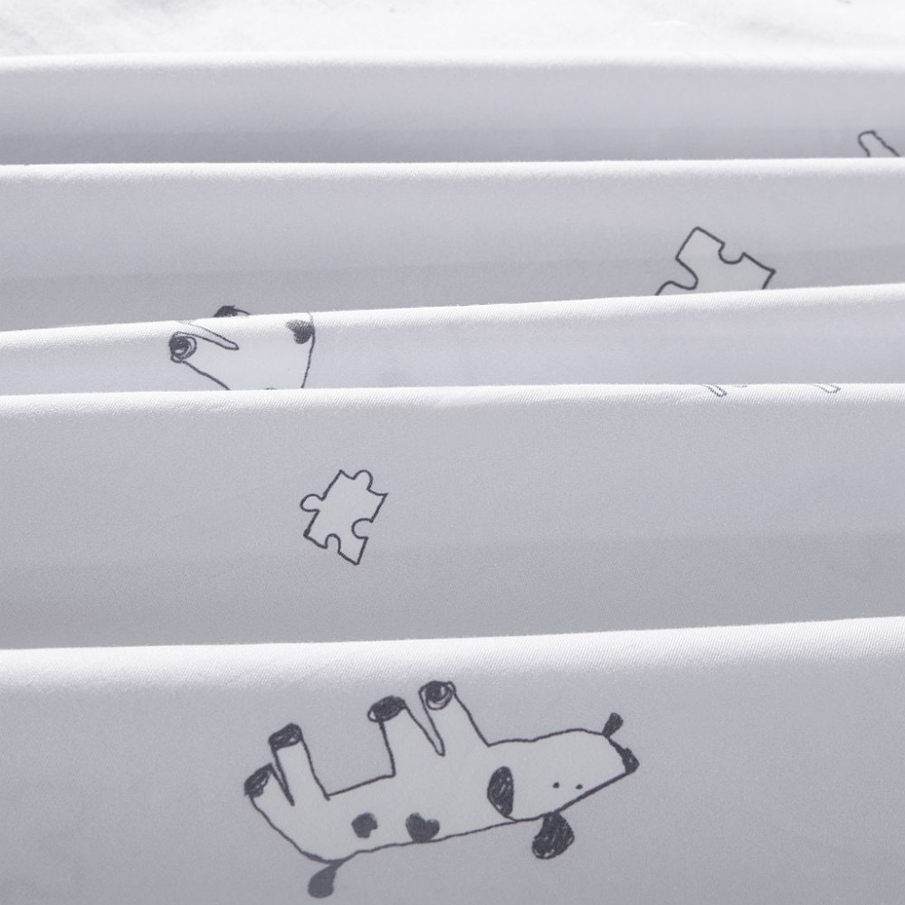 Постельное белье «Bimbo» выполнено в стильной серой гамме и украшено черно-белыми пёсиками с косточками. Внешняя сторона пододеяльника и наволочки сделаны из ткани с принтом. Обратная сторона пододеяльника и простыня выполнены из однотонной ткани-компаньона в сером оттенке.