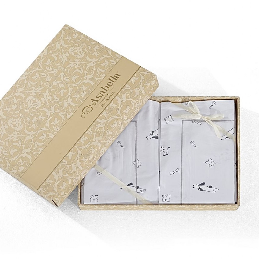 Пододеяльники декорированы "ушками" с трех сторон. Закрываются на скрытую молнию, расположенную внизу пододеяльника. Внутри пододеяльников предусмотрены специальные тесемочки для фиксации одеяла (на одеяле должны быть ответные петли). Эта небольшая деталь сделает использование постельного белья еще комфортнее: одеяло не сбивается в пододеяльнике, и заправлять его становится гораздо удобнее. Наволочки выполнены в оксфордском дизайне - с "ушками" с трех сторон. Ушки наволочек и пододеяльников декорированы атласной строчкой. Наволочки закрываются методом запаха. Простыня в комплекте свободная (прямая). Комплекты упакованы в подарочные коробки.