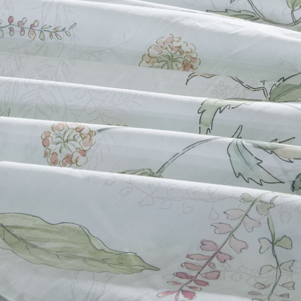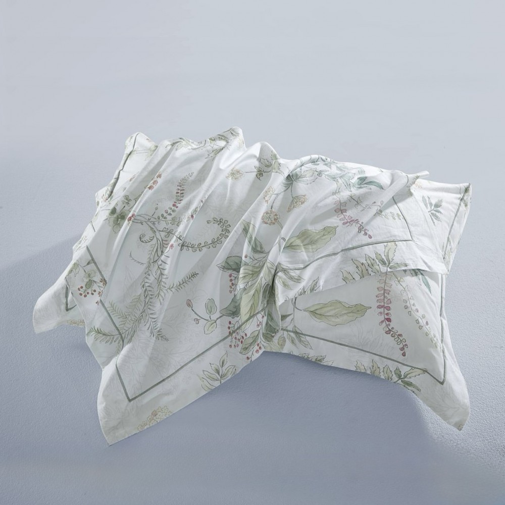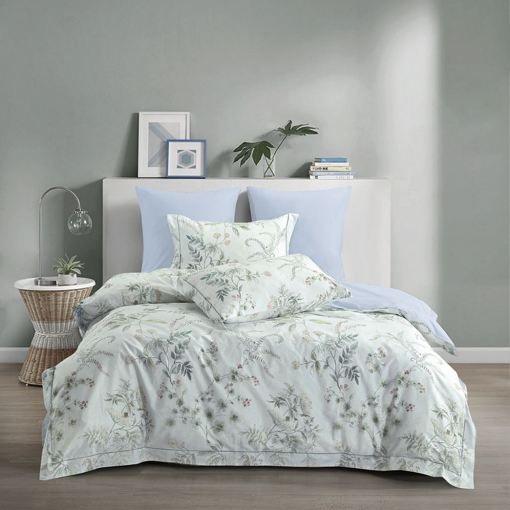 Внешняя сторона пододеяльников и наволочки в размере 50х70 см украшены растительным принтом. Обратная сторона пододеяльников, простыни и наволочки в размере 70х70 см выполнены из ткани-компаньона.