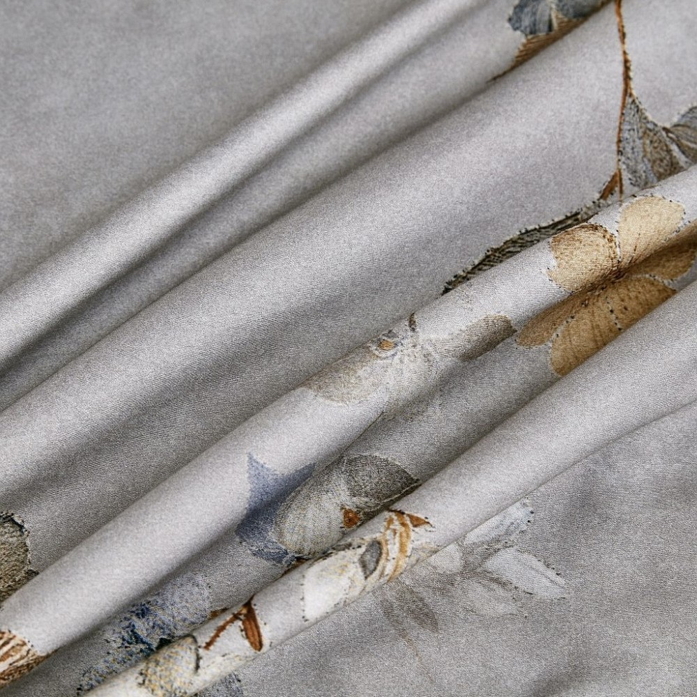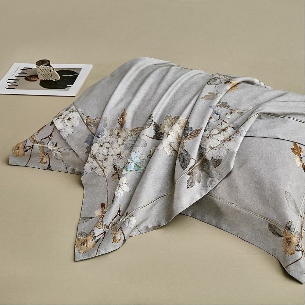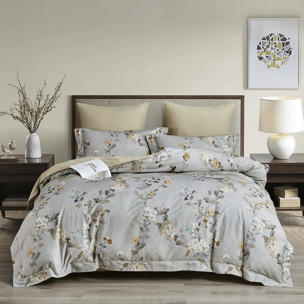 Внешняя сторона пододеяльников и наволочки в размере 50х70 см выполнены из ткани с цветочным принтом. Обратная сторона пододеяльников, простыни и наволочки в размере 70х70 см выполнены из ткани-компаньона.