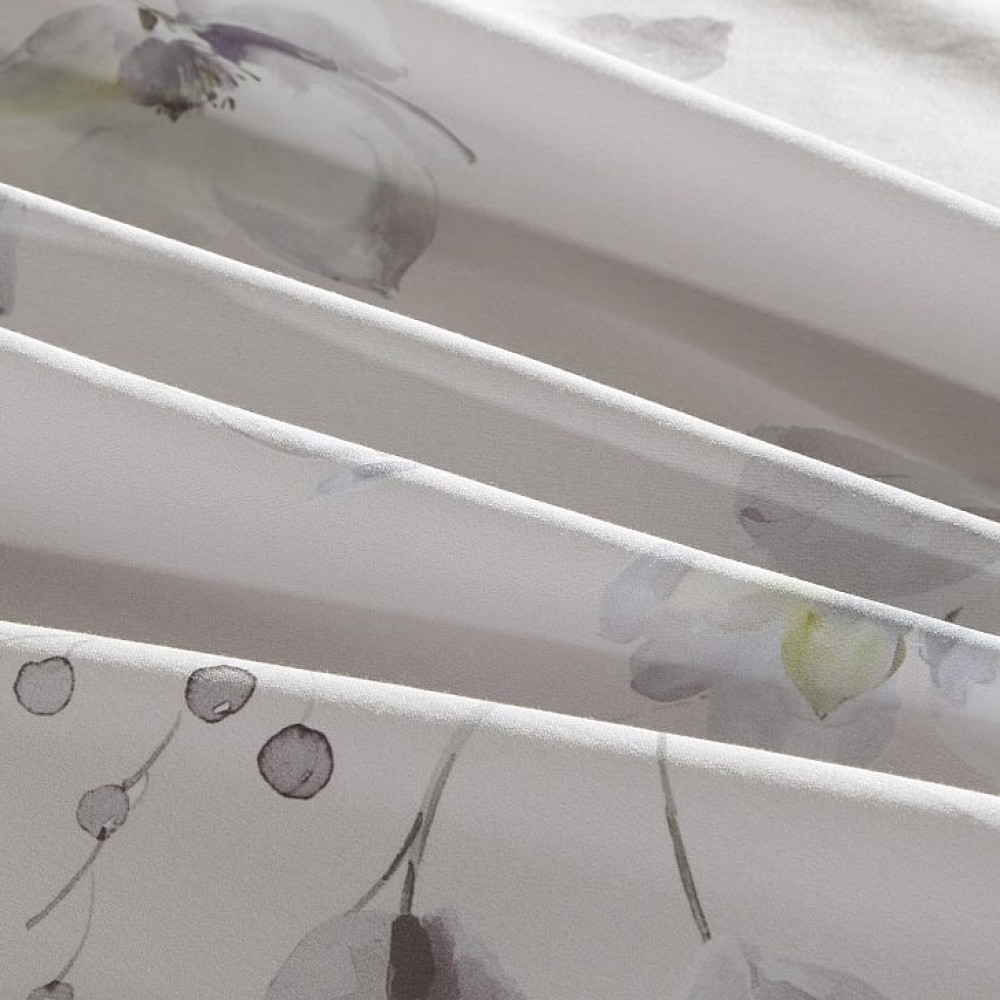 Внешняя сторона пододеяльников и наволочки в размере 50х70 см украшены нежным растительным рисунком. Обратная сторона пододеяльников, простыни и наволочки в размере 70х70 см выполнены из однотонной ткани-компаньона в пыльно-сиреневом оттенке.