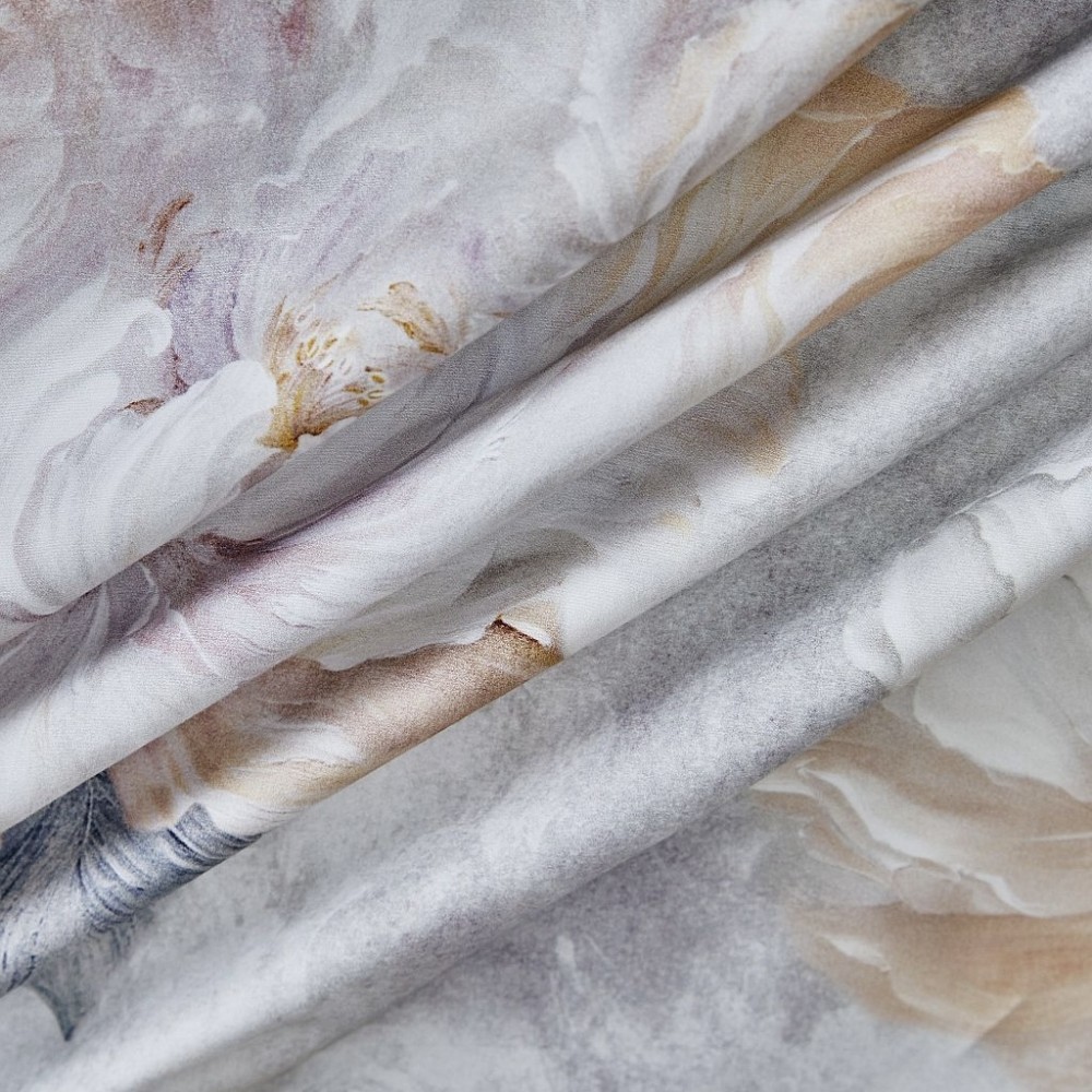 Внешняя сторона пододеяльников и наволочки в размере 50х70 см украшены цветочным принтом. Обратная сторона пододеяльников, простыни и наволочки в размере 70х70 см выполнены из однотонной ткани-компаньона.
