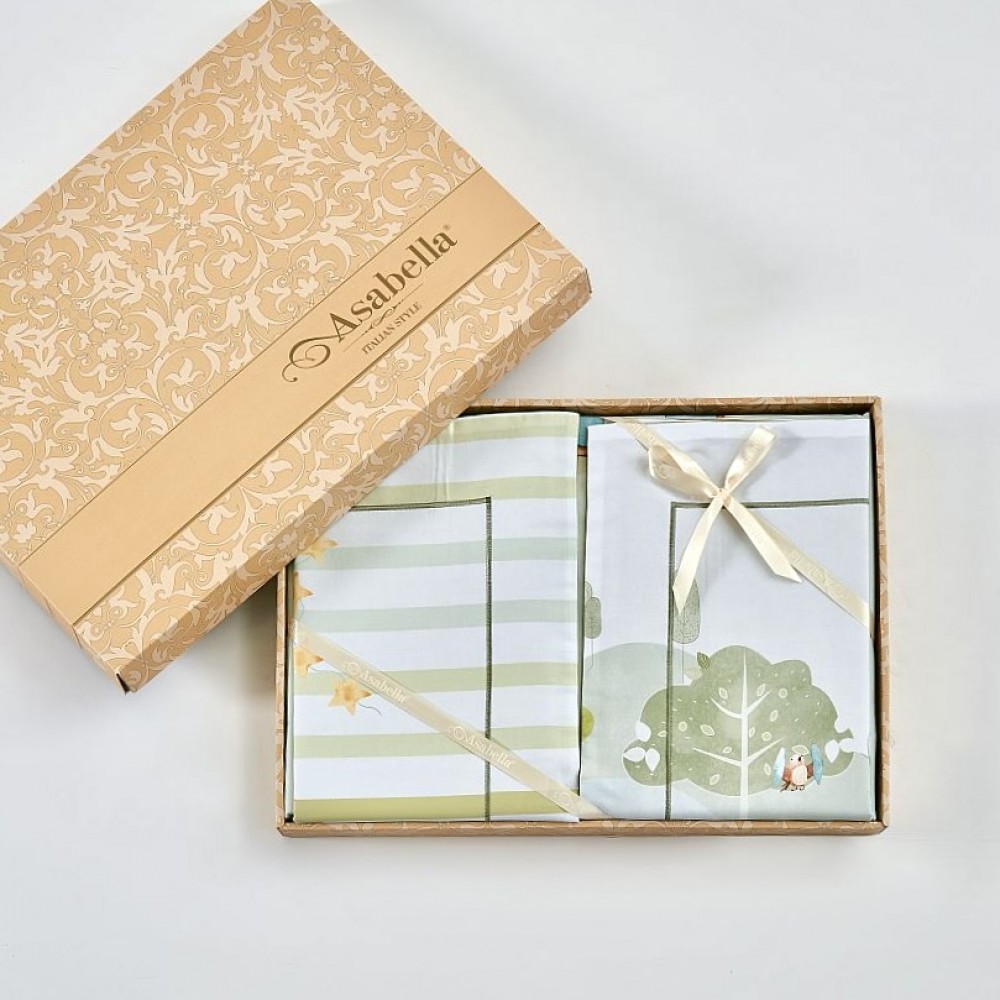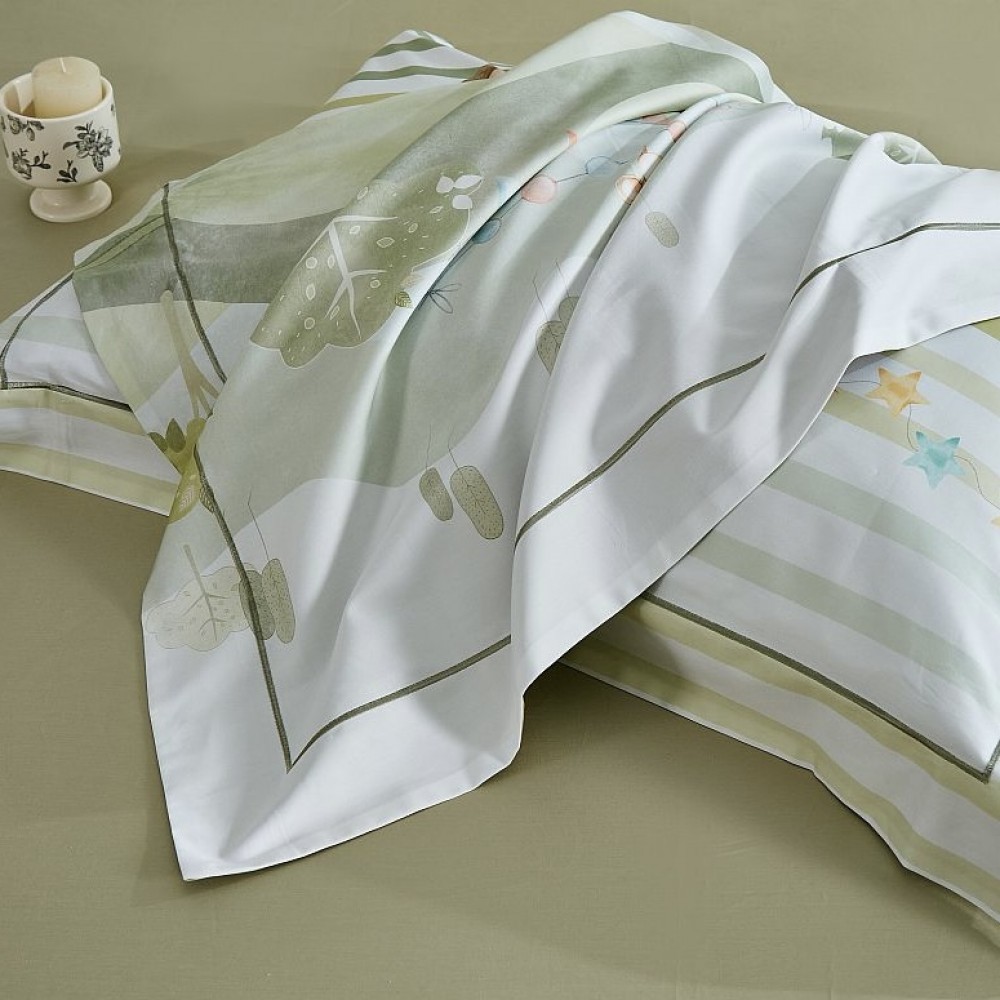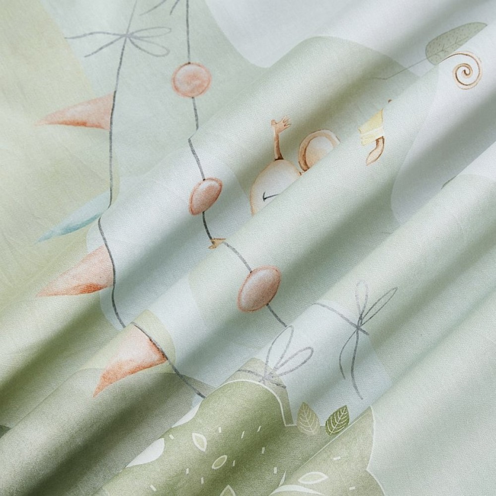 Постельное белье «Цирк» выполнено в светло-зеленой гамме и украшено очаровательными лесными циркачами. Внешняя сторона пододеяльника и наволочек сделаны из ткани с принтом. Обратная сторона пододеяльника, наволочек и простыня выполнены из однотонной ткани-компаньона в золотисто-оливковом оттенке.