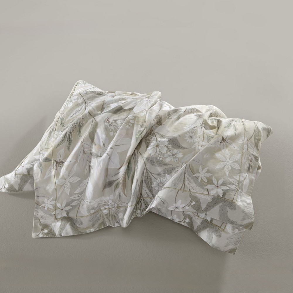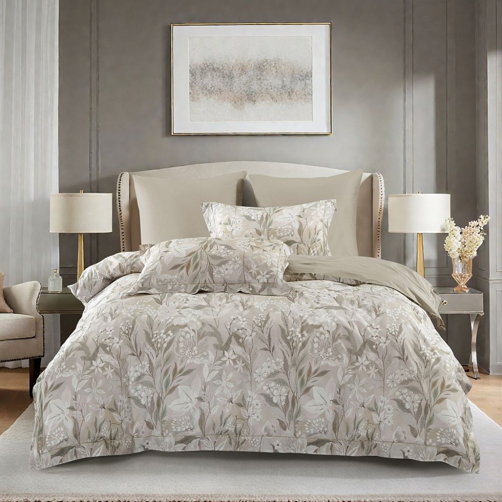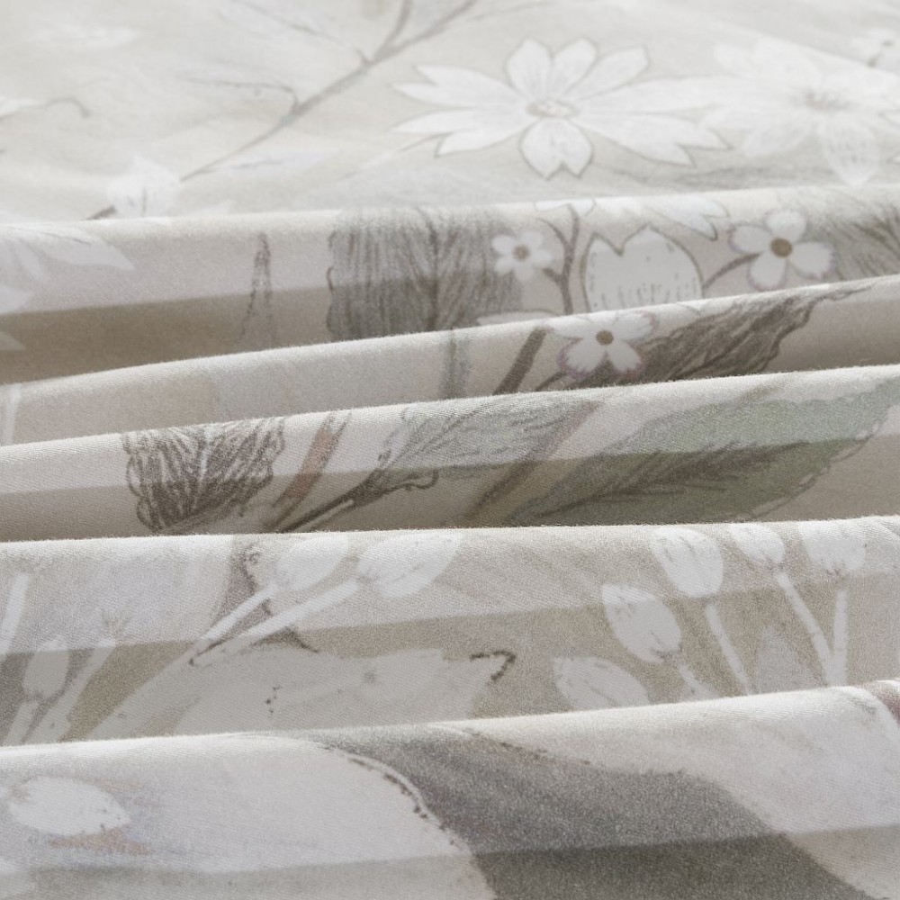Постельное белье «Clementine» выдержано в уютной серо-бежевой гамме. Внешняя сторона пододеяльников и наволочки в размере 50х70 см украшены цветочным принтом. Обратная сторона пододеяльников, простыни и наволочки в размере 70х70 см выполнены из ткани-компаньона.