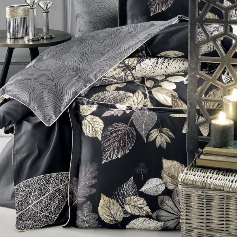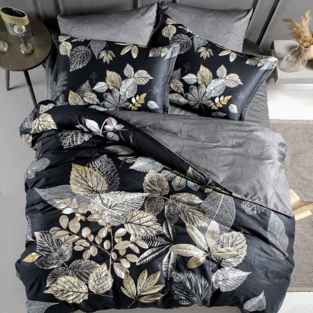 Постельное белье «Daring Grey» выполнено в темных тонах и украшено принтом с золотыми листьями. Внешняя сторона пододеяльников и наволочек в размере 50х70 см украшены принтом с листьями. Обратная сторона и наволочки в размере 70х70 см выполнены в сером оттенке. Простыни сделаны из однотонной ткани-компаньона.