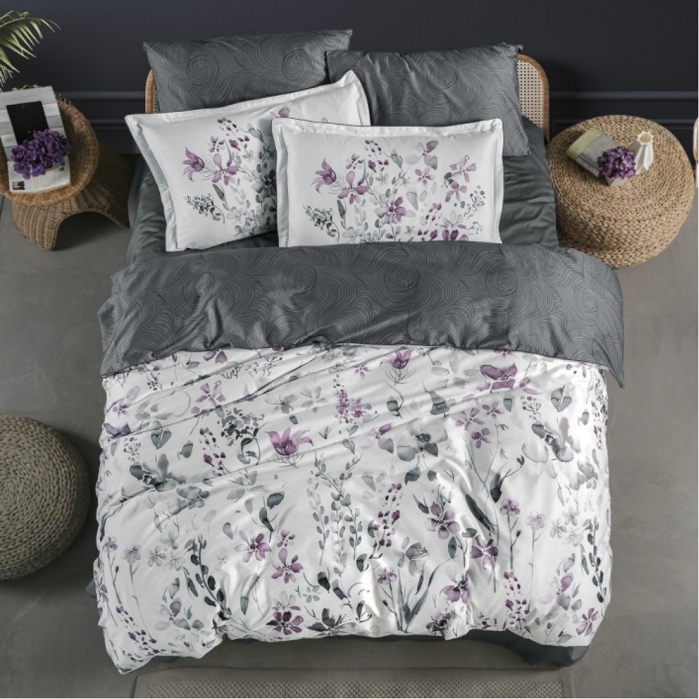 Постельное белье «Delcina Grey» сочетает акварельные цветы и строгий серый оттенок. Внешняя сторона пододеяльников и наволочек в размере 50х70 см выполнены в белом цвете и украшены цветами. Обратная сторона и наволочки в размере 70х70 см выполнены из ткани в сером оттенке с принтом. Простыни сделаны из однотонной ткани-компаньона.