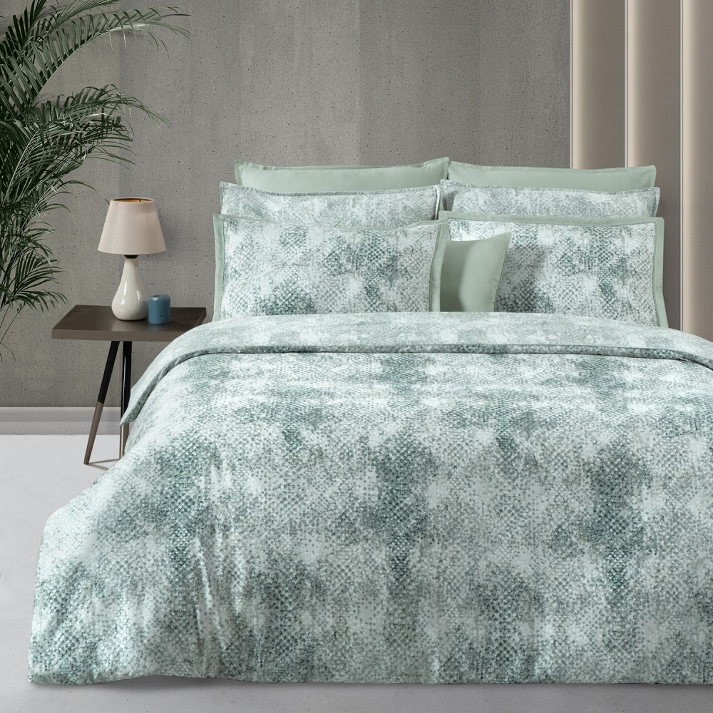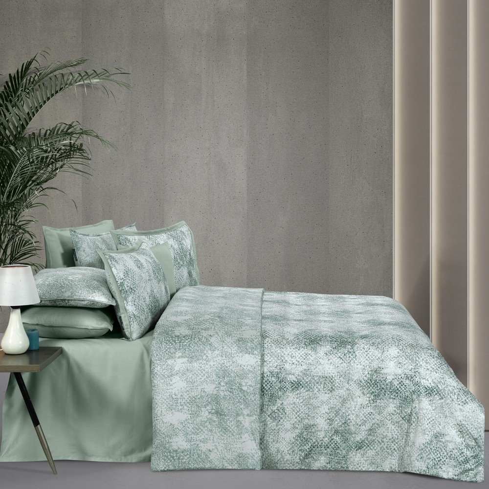 Постельное белье «Dnipro» выполнено в изумрудно-зеленой гамме. В дизайне использованы три дополняющих друг друга ткани. Основная ткань украшена принтом, напоминающим кожу питона. Вторая ткань идет с таким же принтом, но с более сглаженным контрастом. И третья ткань-компаньон однотонная.
