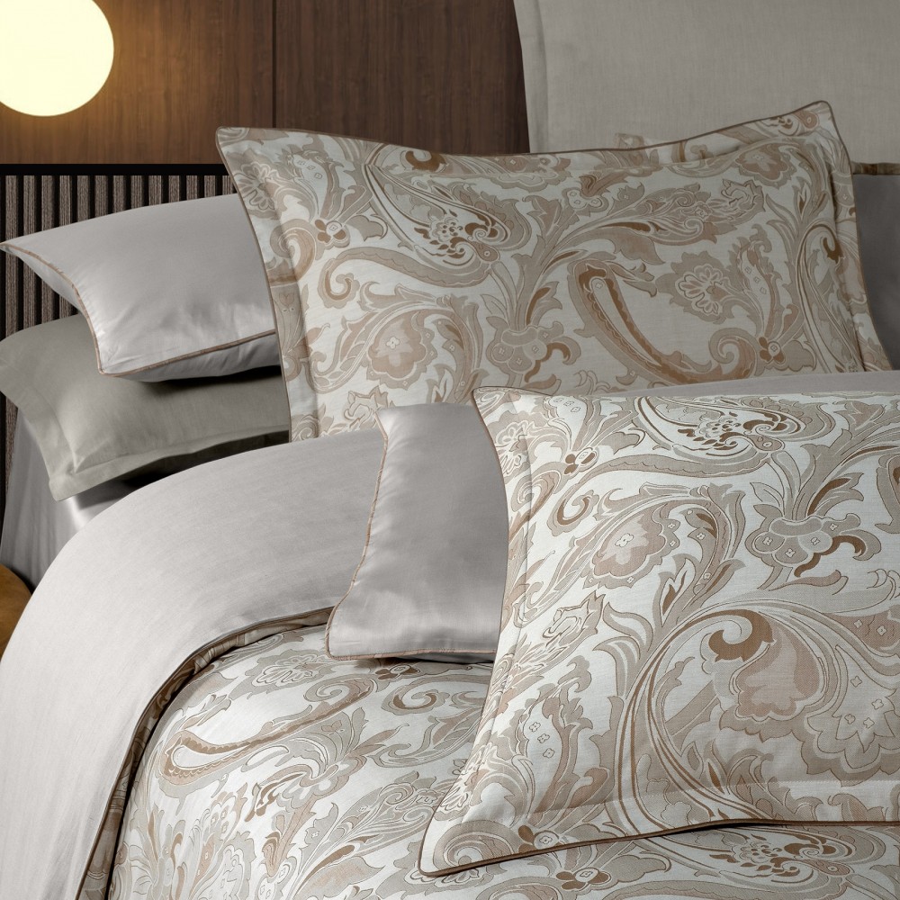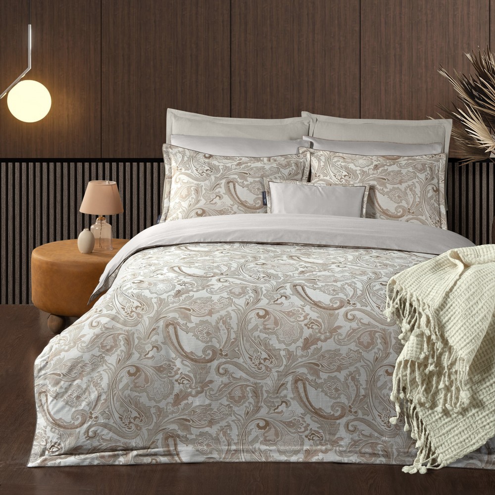 Комплекты постельного белья «Fredo» выполнены из шикарного пестротканого жаккарда плотностью 300ТС. Дополняет жаккард сатин двух оттенков. Благородные серо-бежевые оттенки и витиеватые узоры создают изысканный тандем. Внешняя сторона пододеяльников и основных наволочек выполнены из жаккарда. Обратная сторона, дополнительные наволочки и простыни сделаны из сатина.