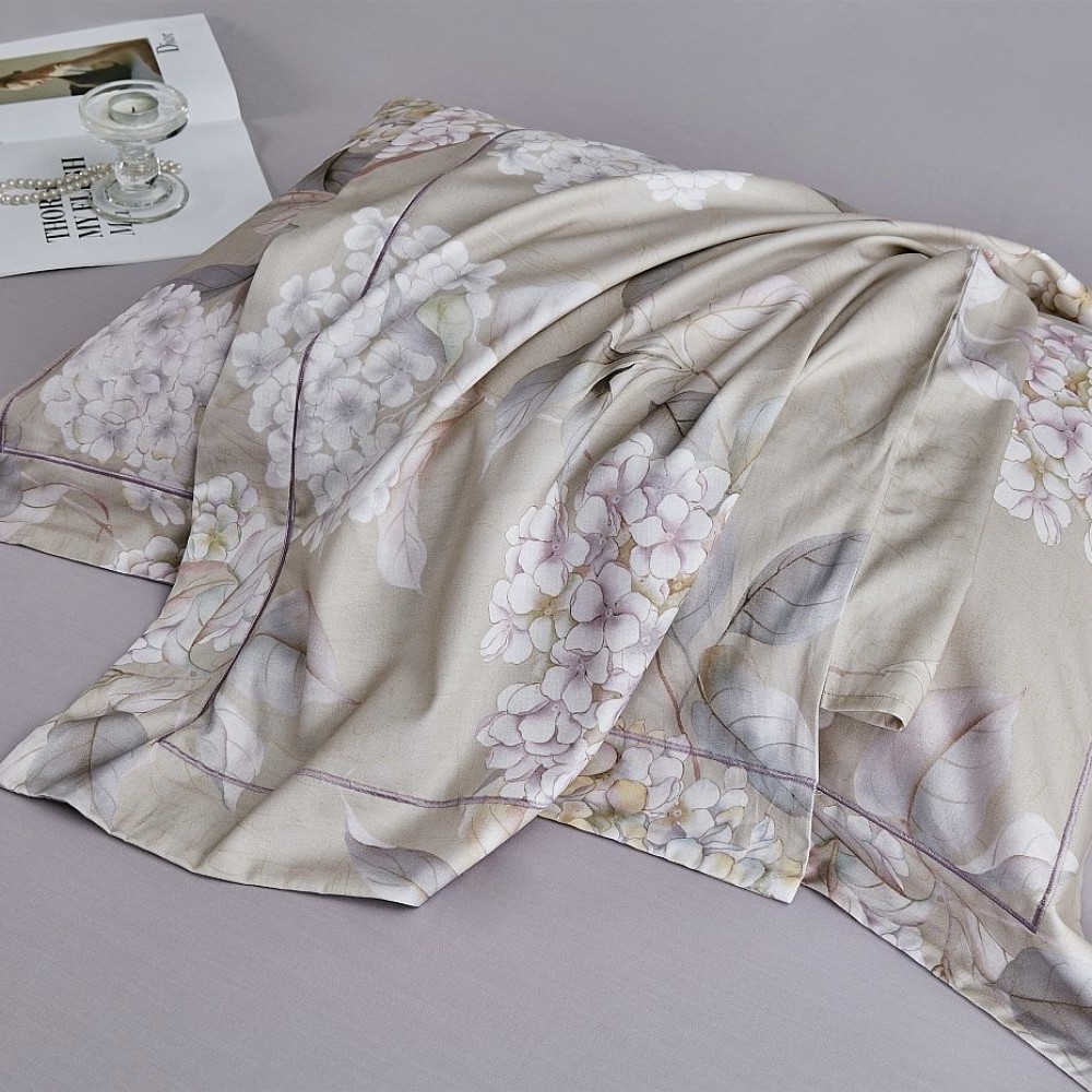 Внешняя сторона пододеяльников и наволочки в размере 50х70 см украшены крупными гортензиями. Обратная сторона пододеяльников, простыни и наволочки в размере 70х70 см выполнены из ткани-компаньона.