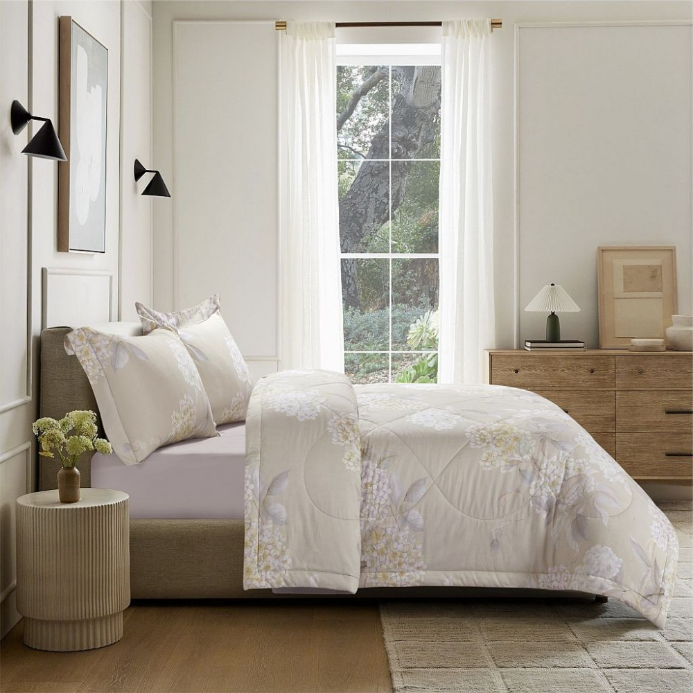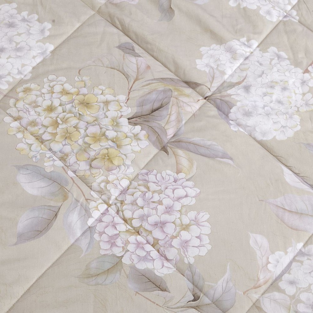 В комплектах вместо традиционных пододеяльников добавлены одеяла-комфортеры. Эти легкие летние одеяла наполнены тенселем и искусственным шелком в равных пропорциях. Воздушные, "дышащие", неприхотливые в уходе. Внешняя сторона одеял и наволочки украшены гортензиями. Обратная сторона одеял и простыни выполнены из ткани-компаньона.