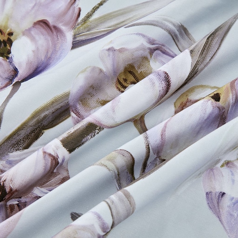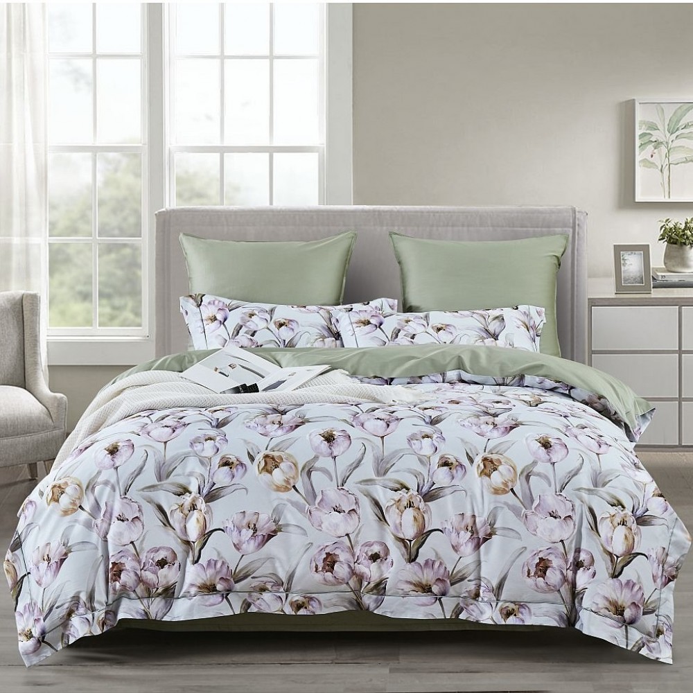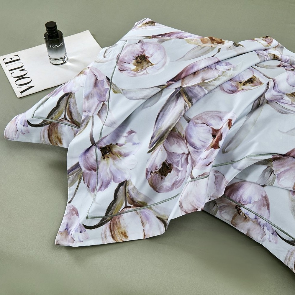 Внешняя сторона пододеяльников и наволочки в размере 50х70 см украшены тюльпанами. Обратная сторона пододеяльников, простыни и наволочки в размере 70х70 см выполнены из однотонной ткани-компаньона.
