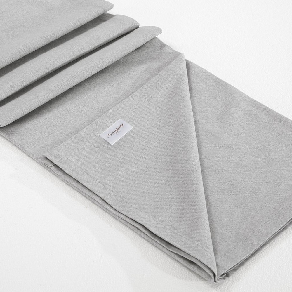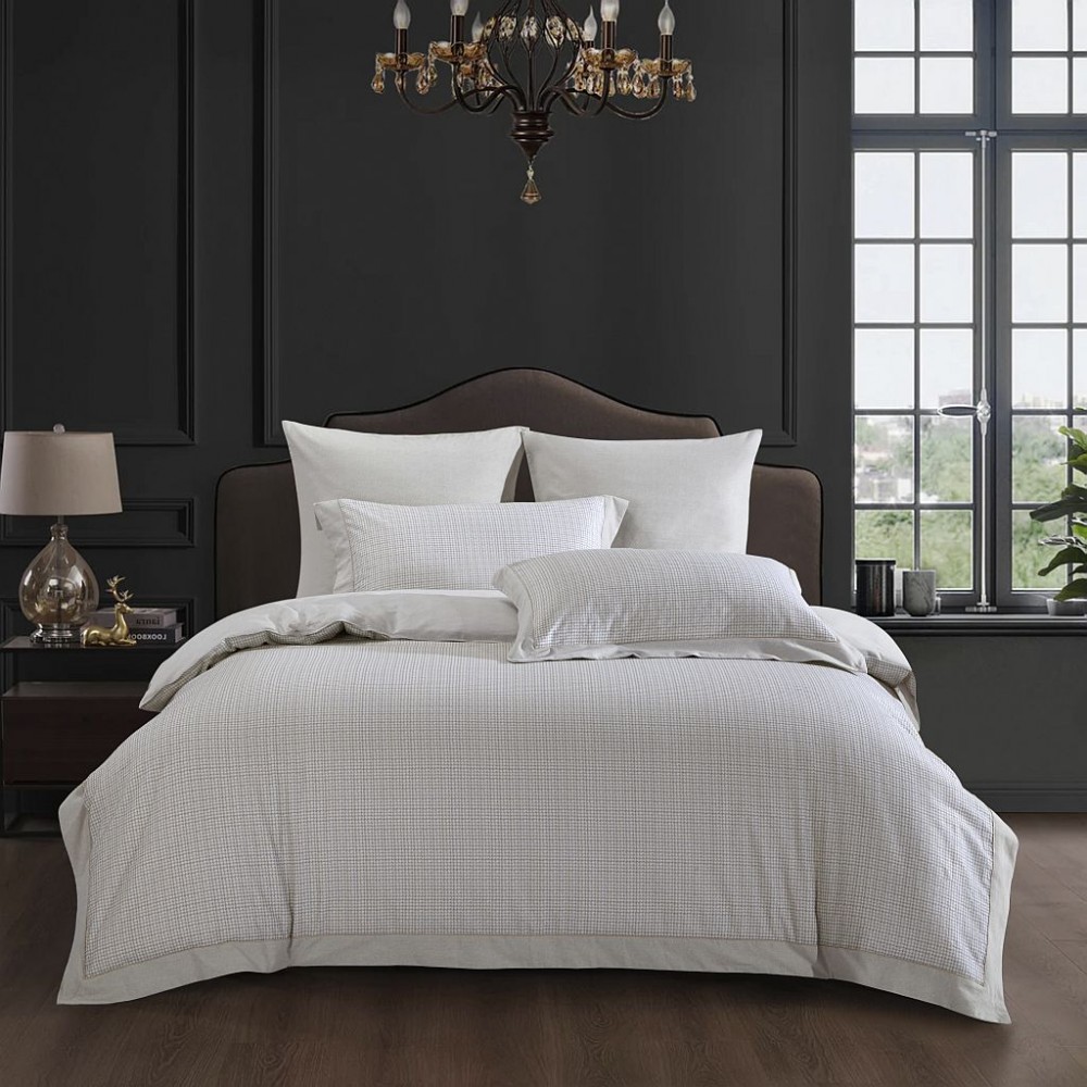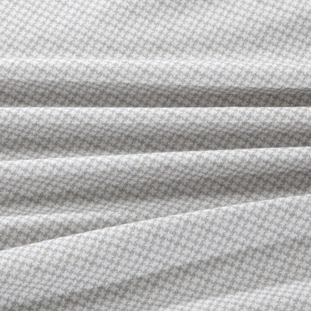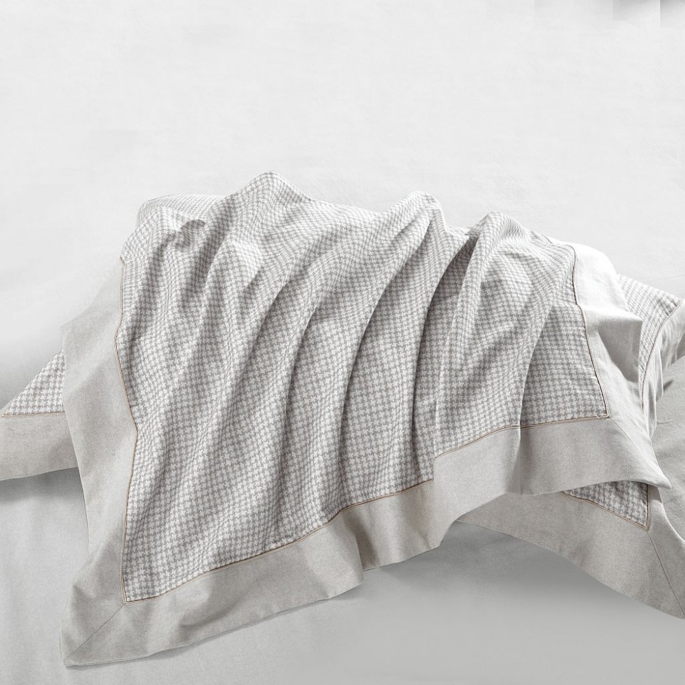 Внешняя сторона пододеяльников и наволочки в размере 50х70 см выполнены из ткани с принтом гусиная лапка. Обратная сторона пододеяльников, простыни и наволочки в размере 70х70 см выполнены из ткани-компаньона с меланжевым эффектом.